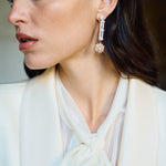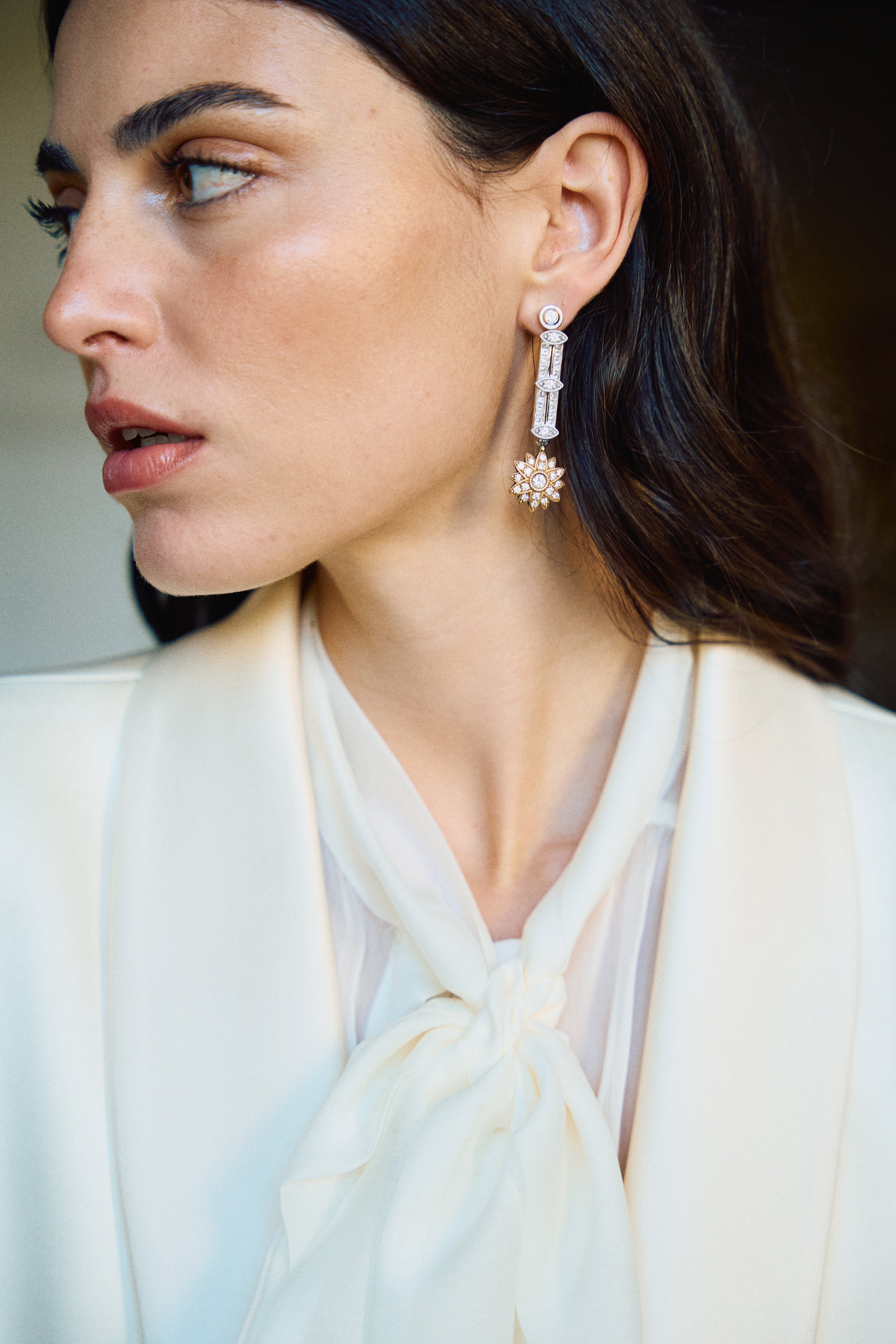 These earrings are pure light, the expression of femininity, the main stone is diamonds of different sizes, a design that plays with the combination of white gold and yellow gold, and highlights strength and greatness, and the result is a work of art.