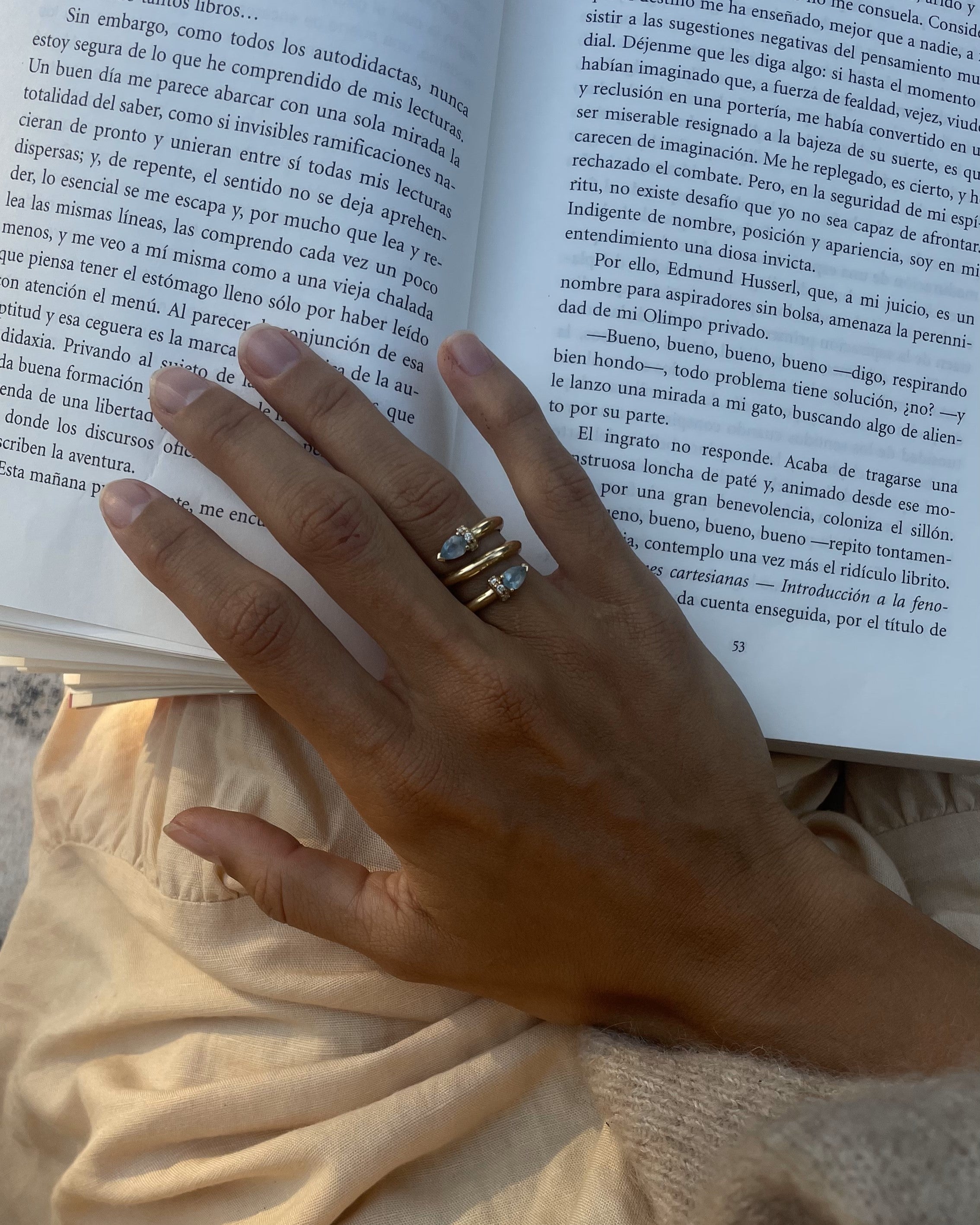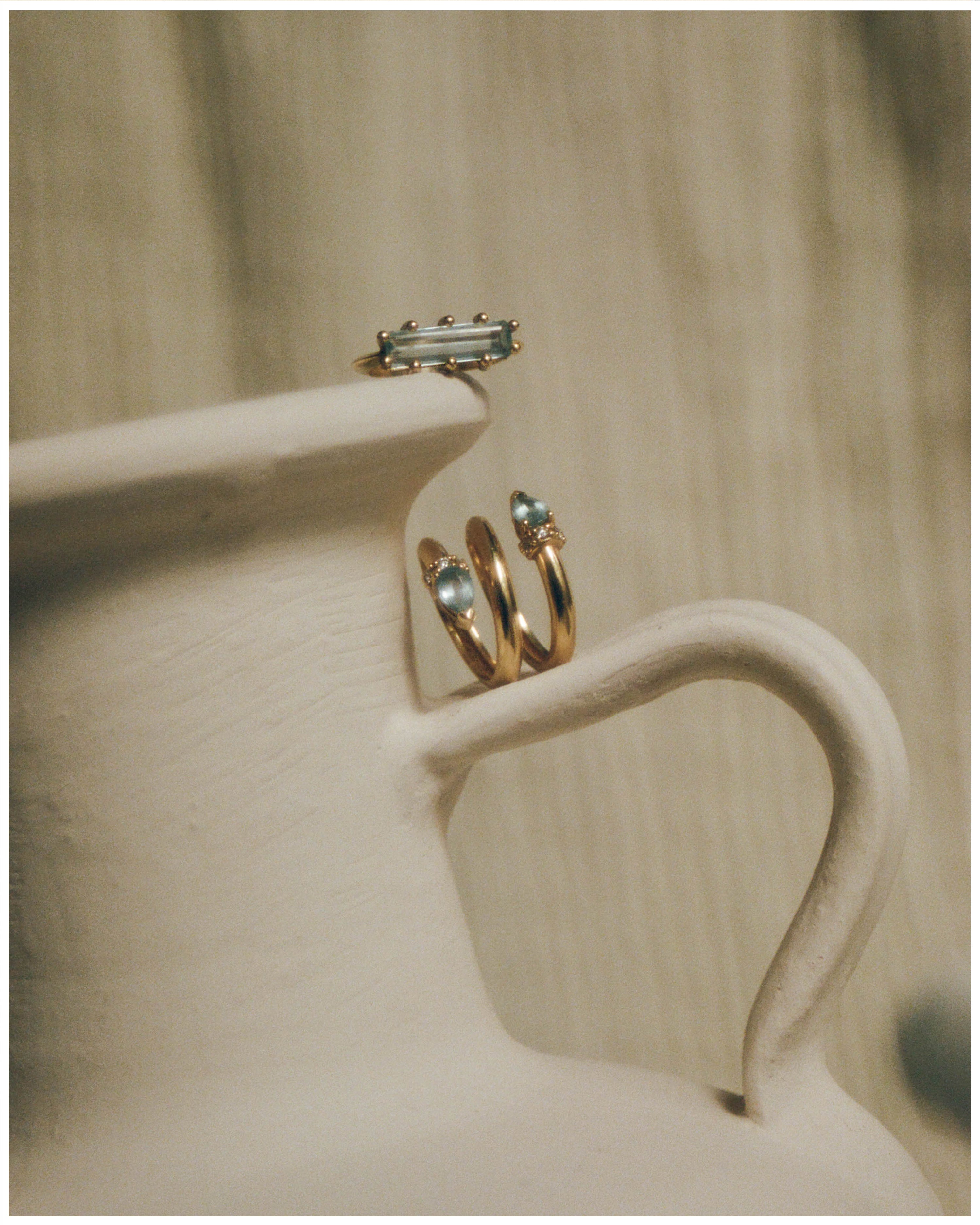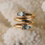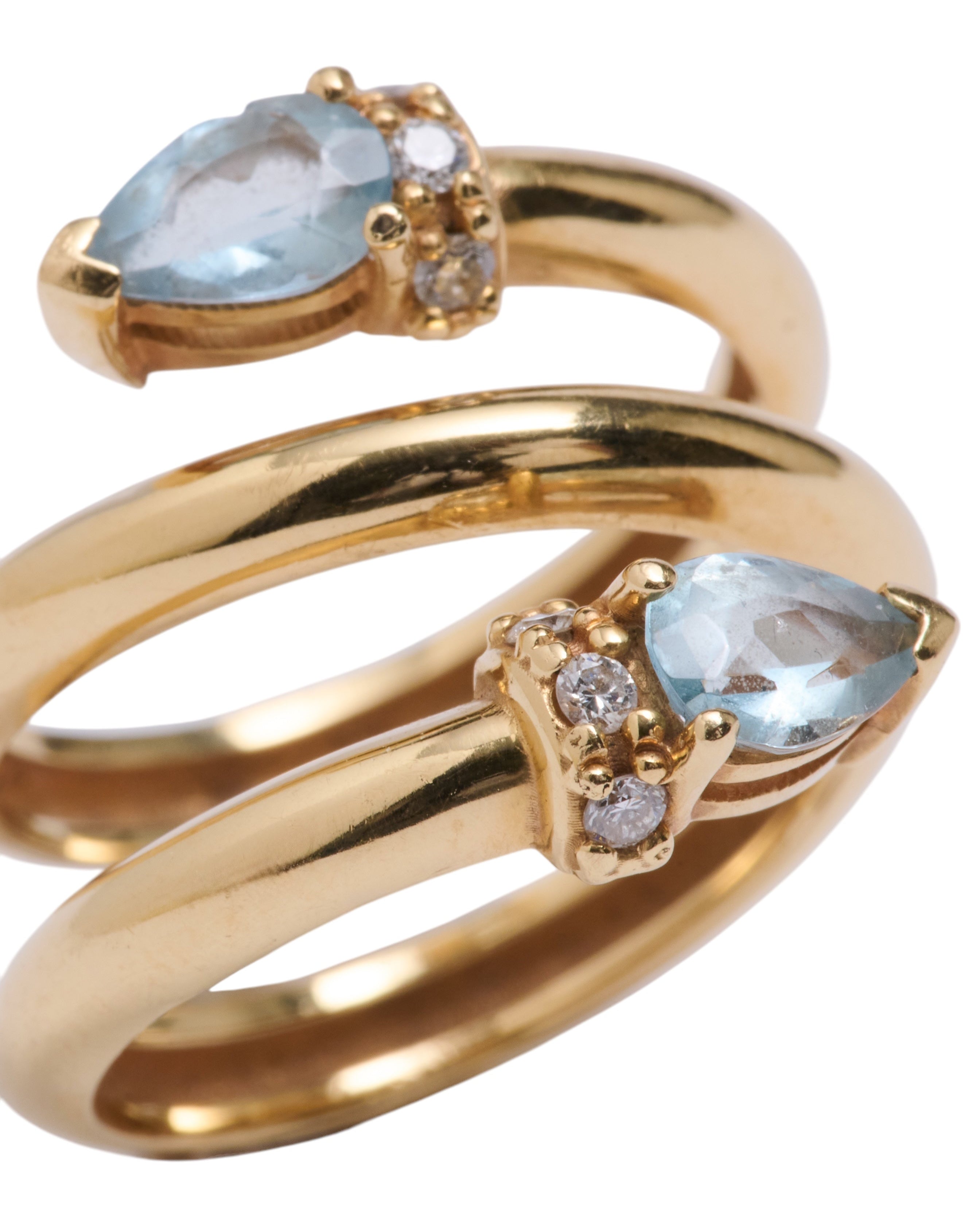 A ring that will make you dream, that hypnotizes you and enthralls you when you look at it. With two pear-cut aquamarines at each end, this ring owes its name "Aphrodite" to its beauty and soft shapes.