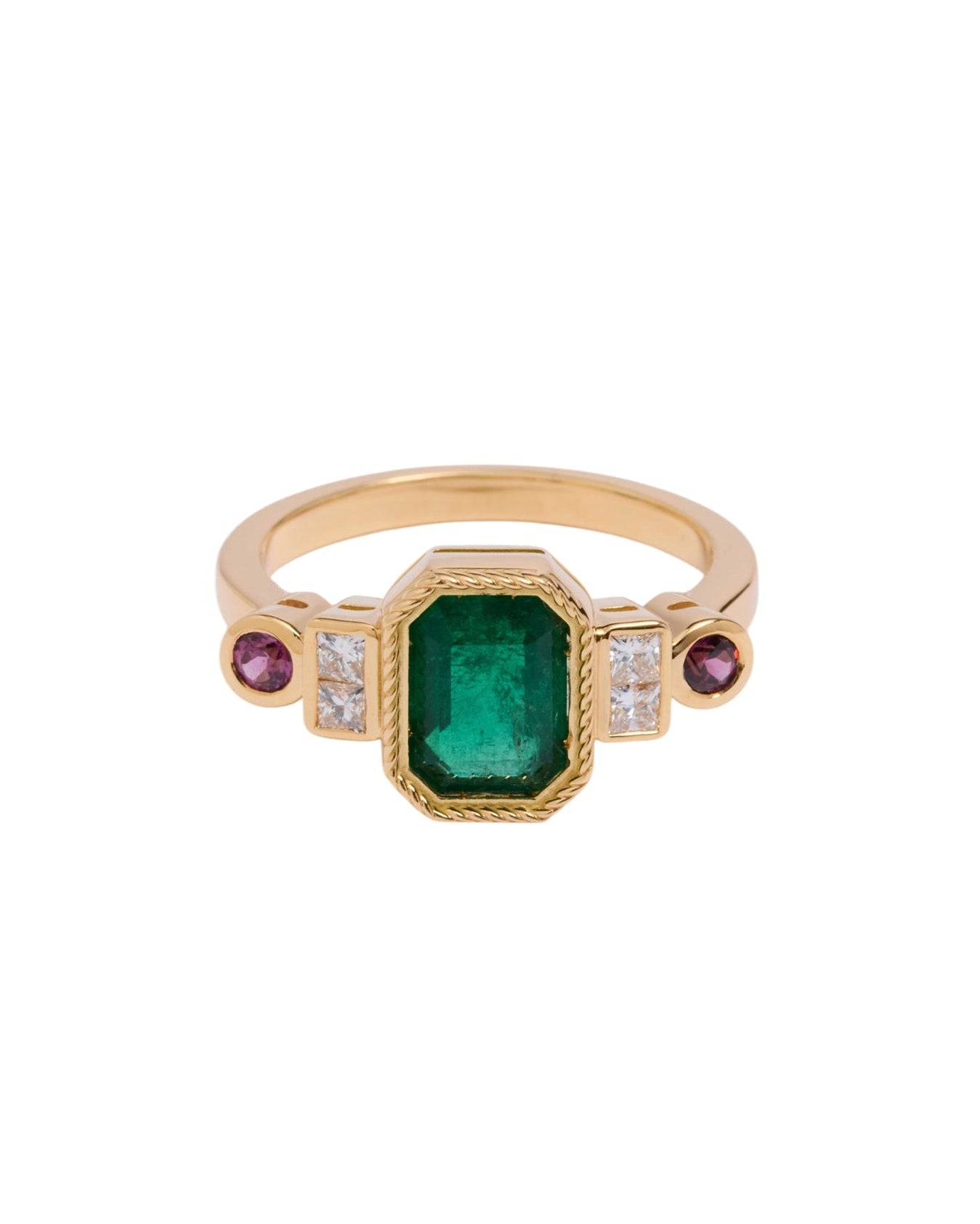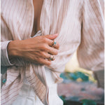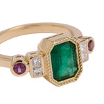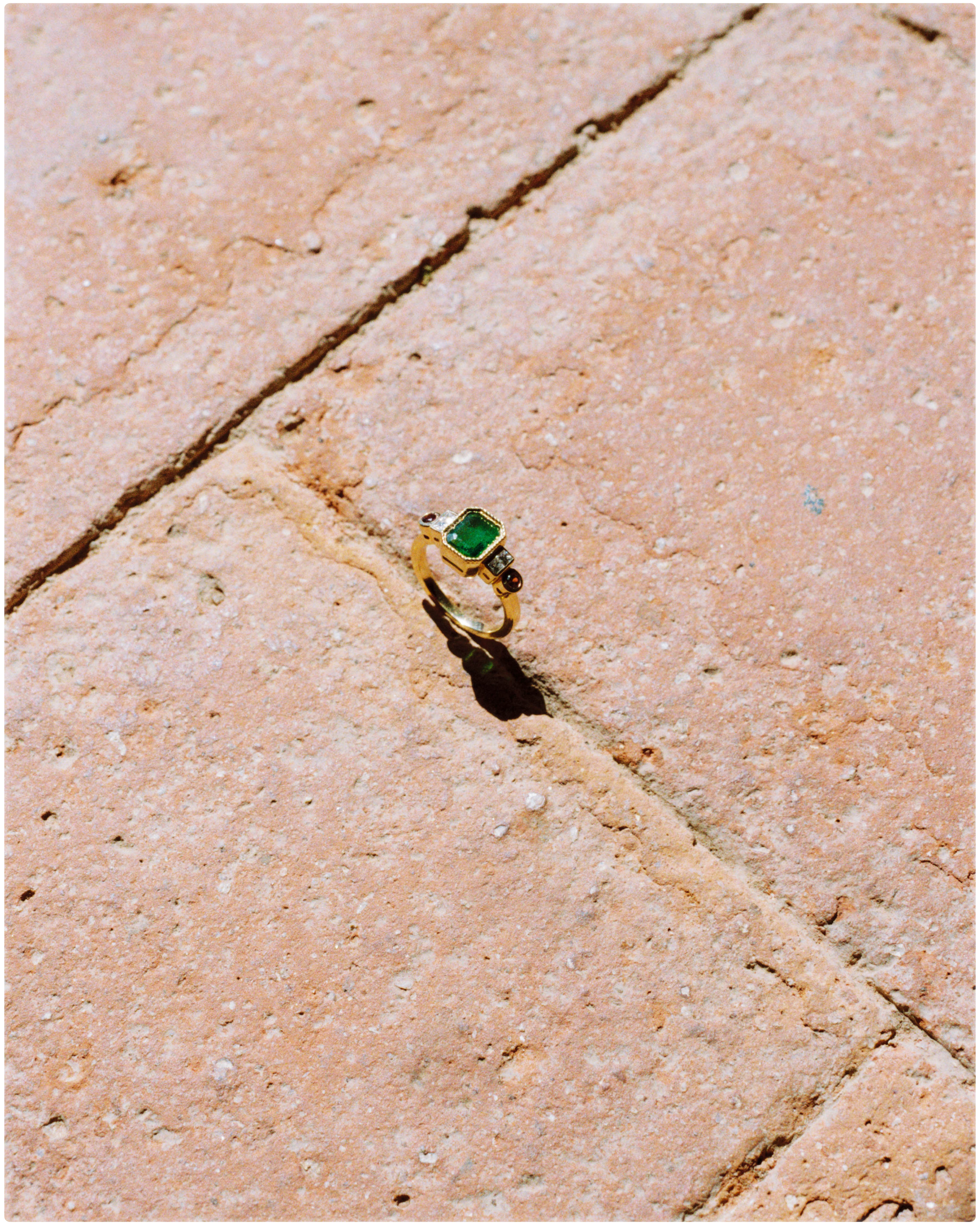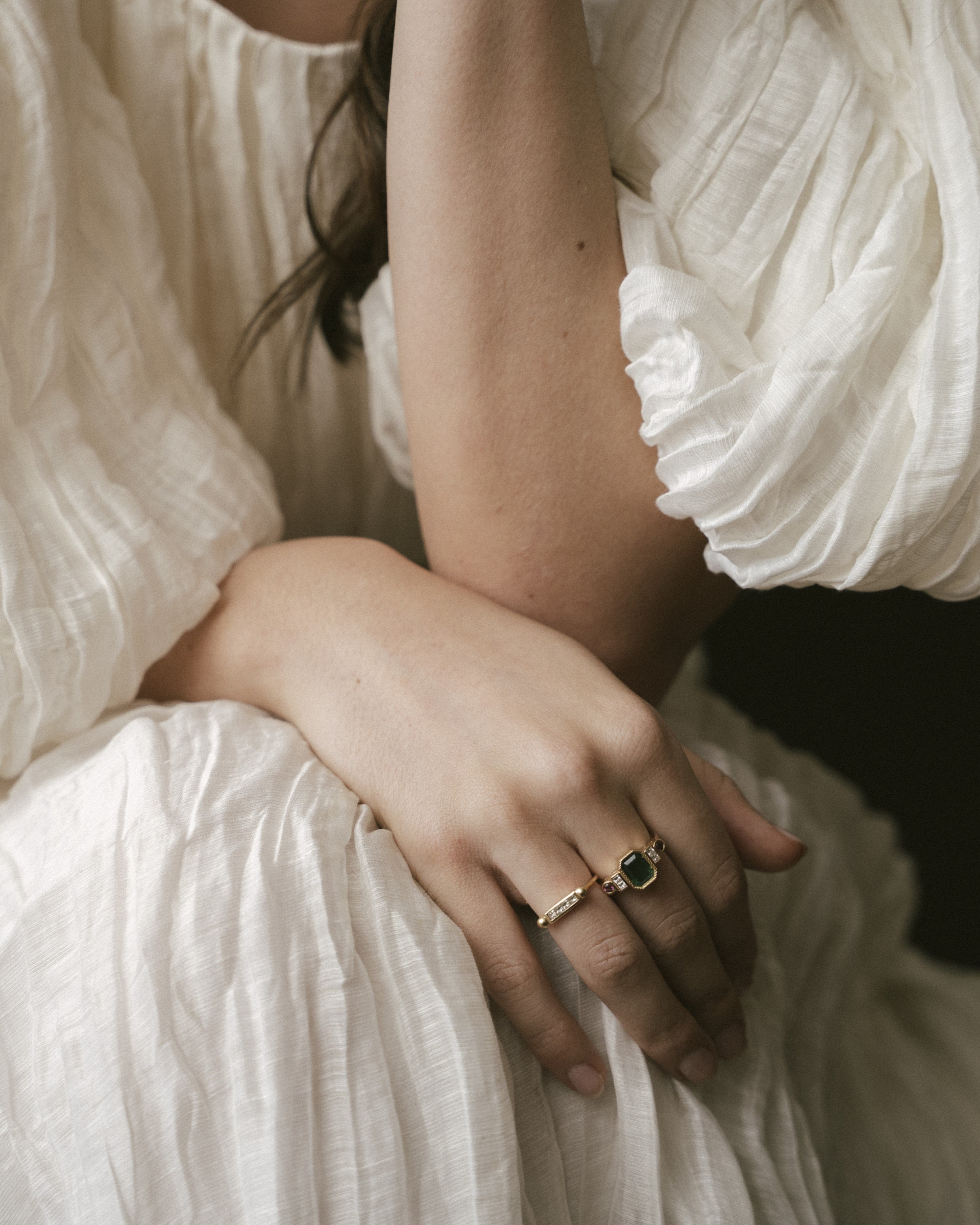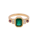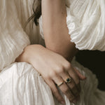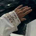 The jewel is the crown of this collection, this ring features an emerald that captivates us as soon as we look at it, and connects us with the deepest nature. The emerald is, without a doubt, one of the most magical stones that exists, with its irregularities known as 'gardens' there are no two alike, and that is what makes them so special. This ring is an ode to the garden with its colors and beauty.