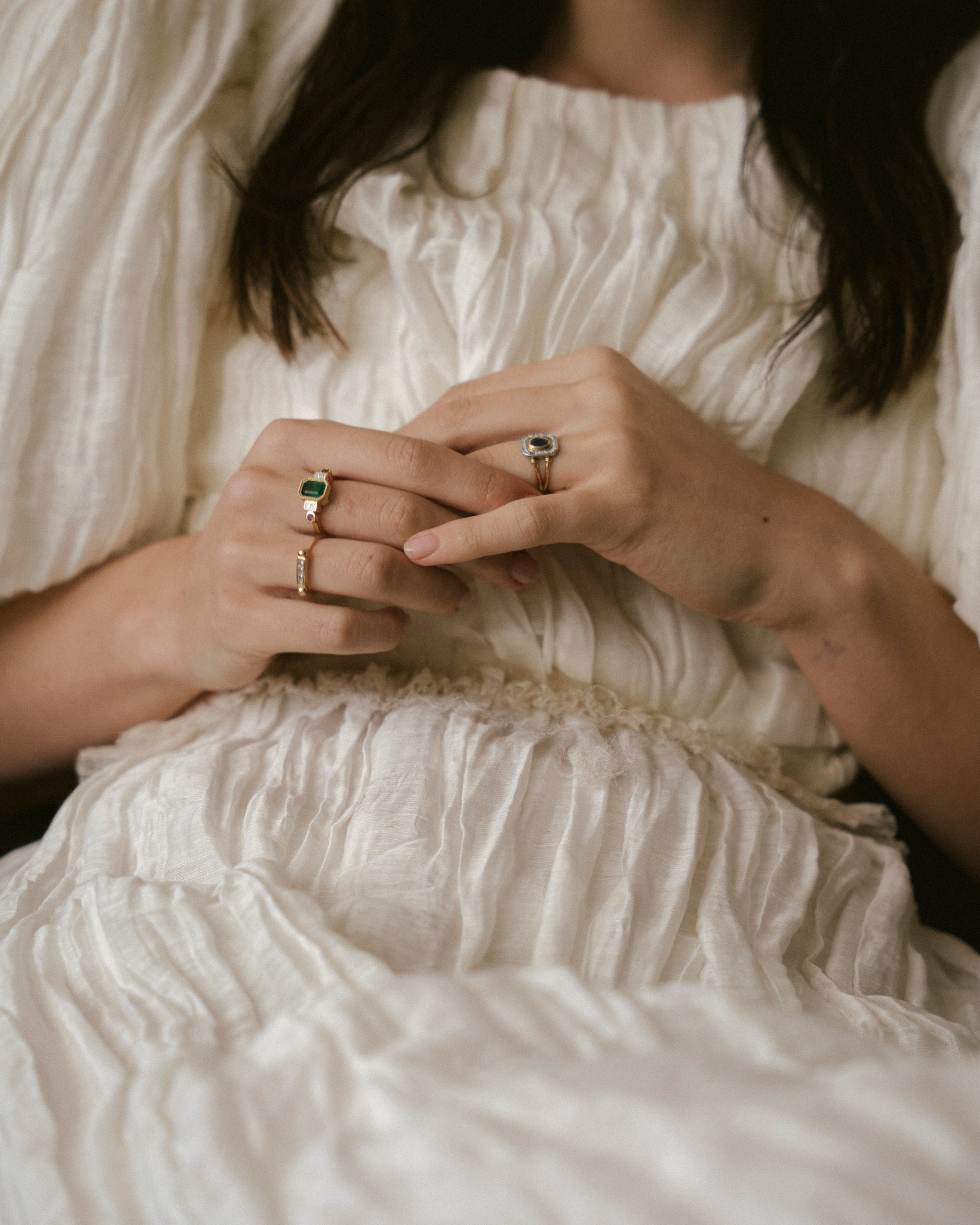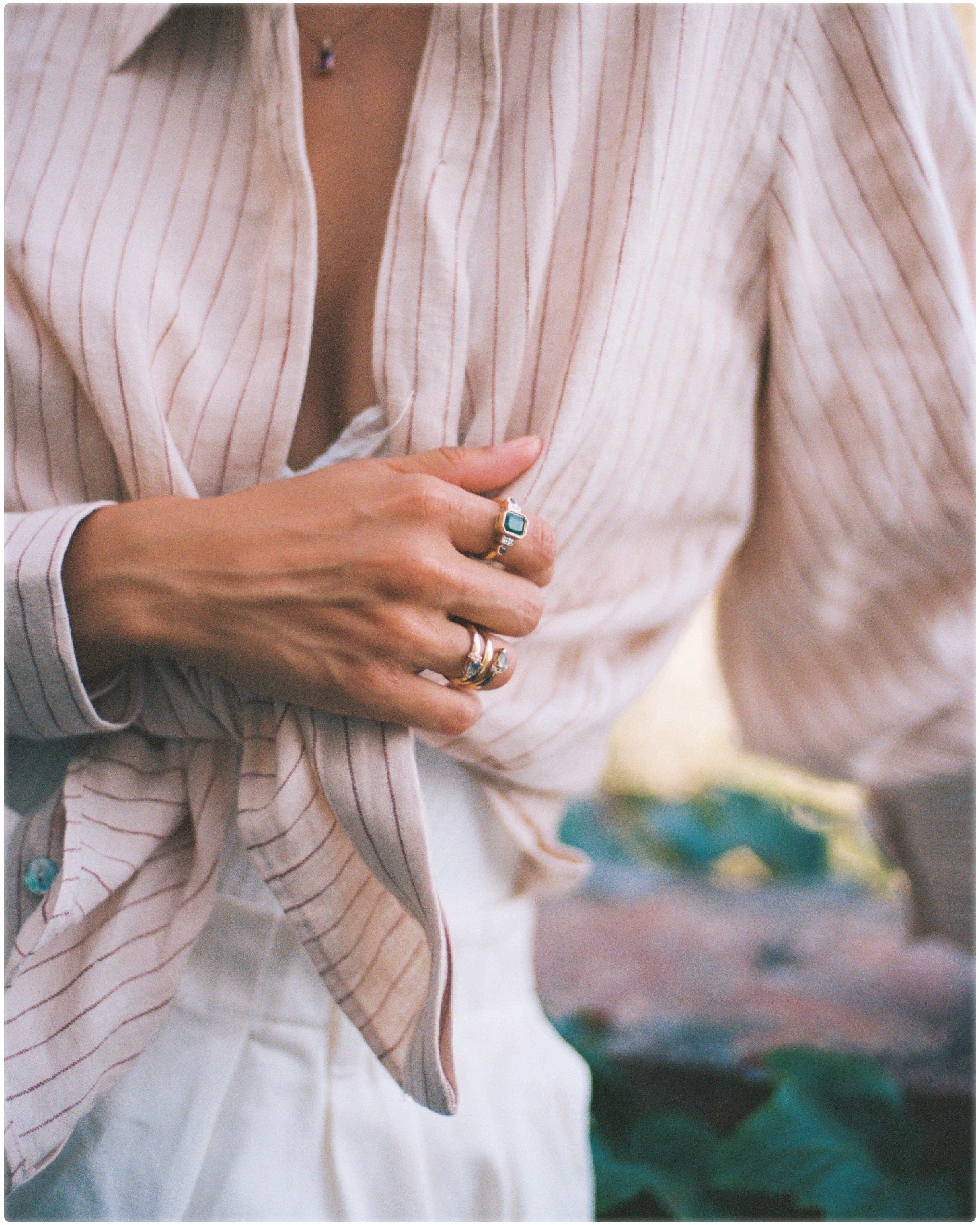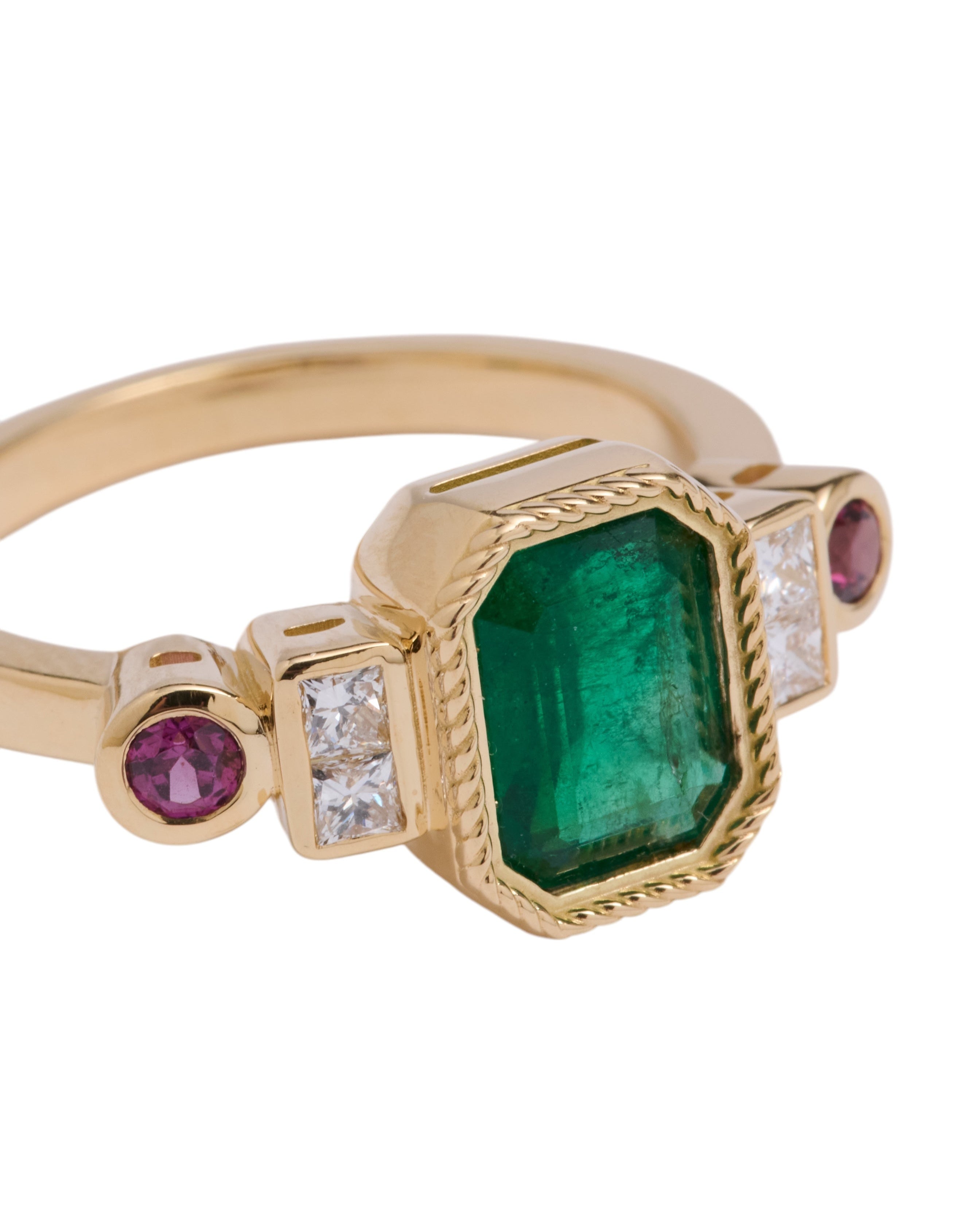 The jewel is the crown of this collection, this ring features an emerald that captivates us as soon as we look at it, and connects us with the deepest nature. The emerald is, without a doubt, one of the most magical stones that exists, with its irregularities known as 'gardens' there are no two alike, and that is what makes them so special. This ring is an ode to the garden with its colors and beauty.