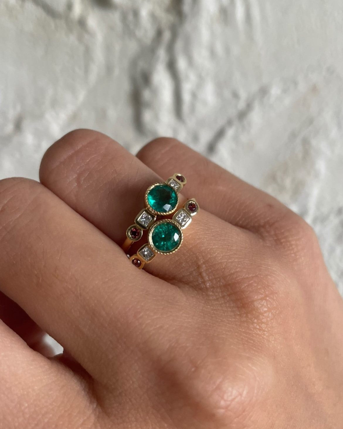 A 5mm central emerald (0.46 carats).