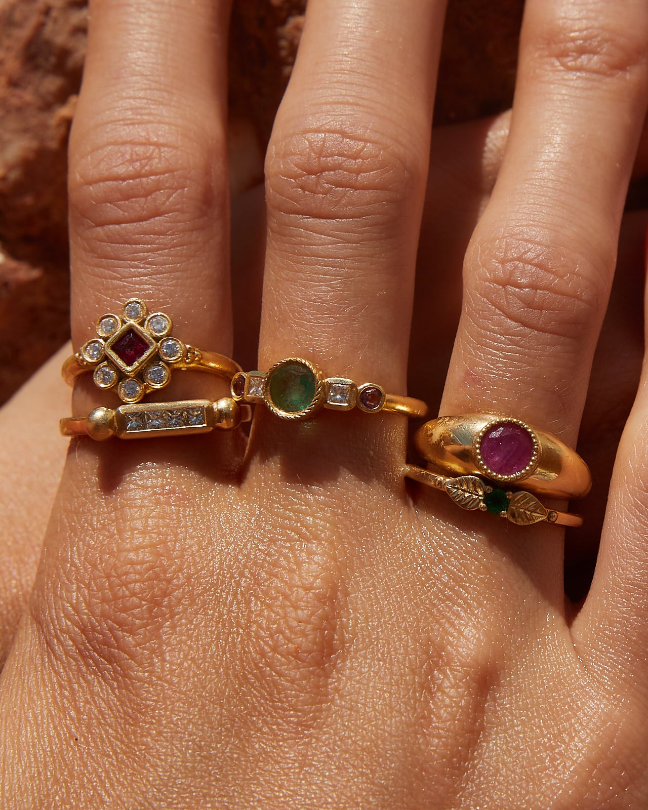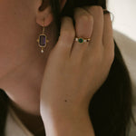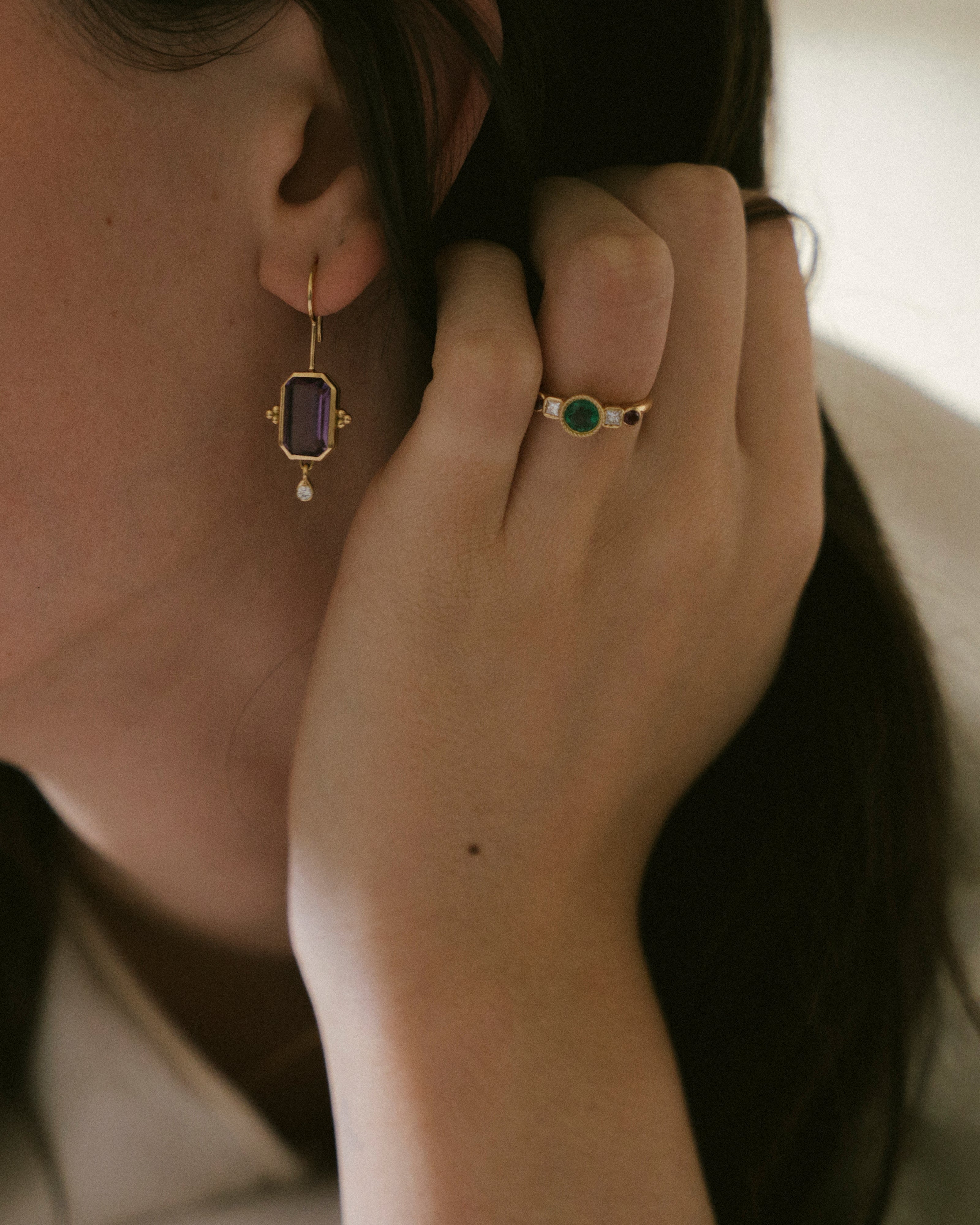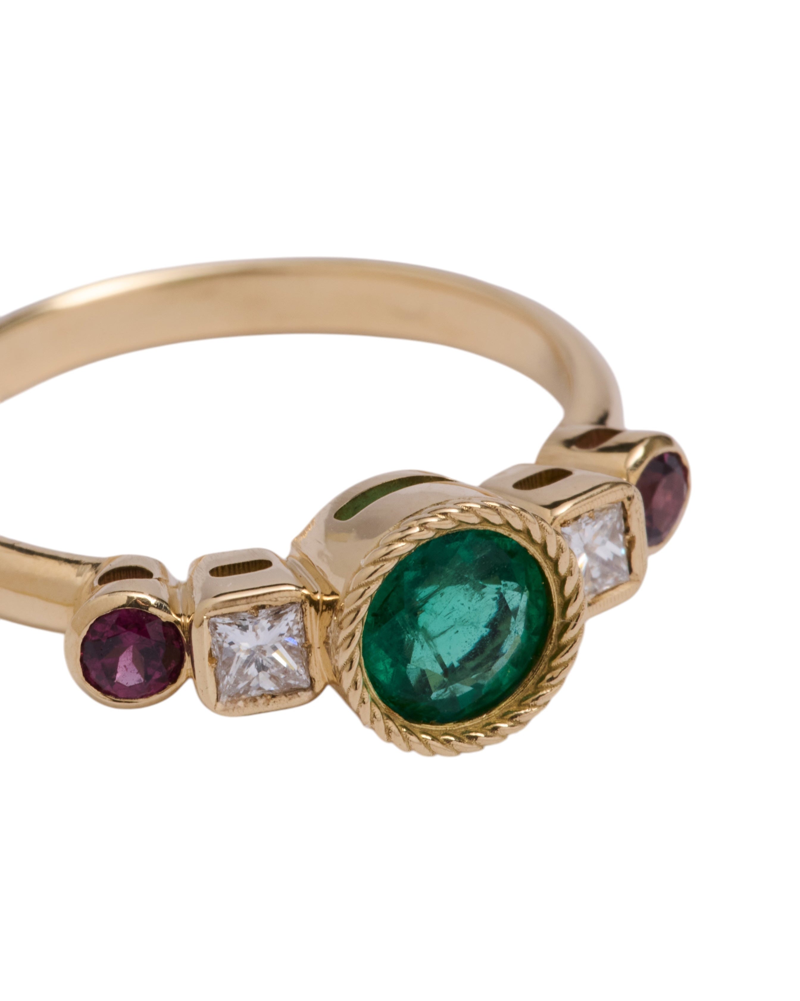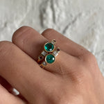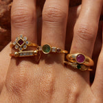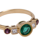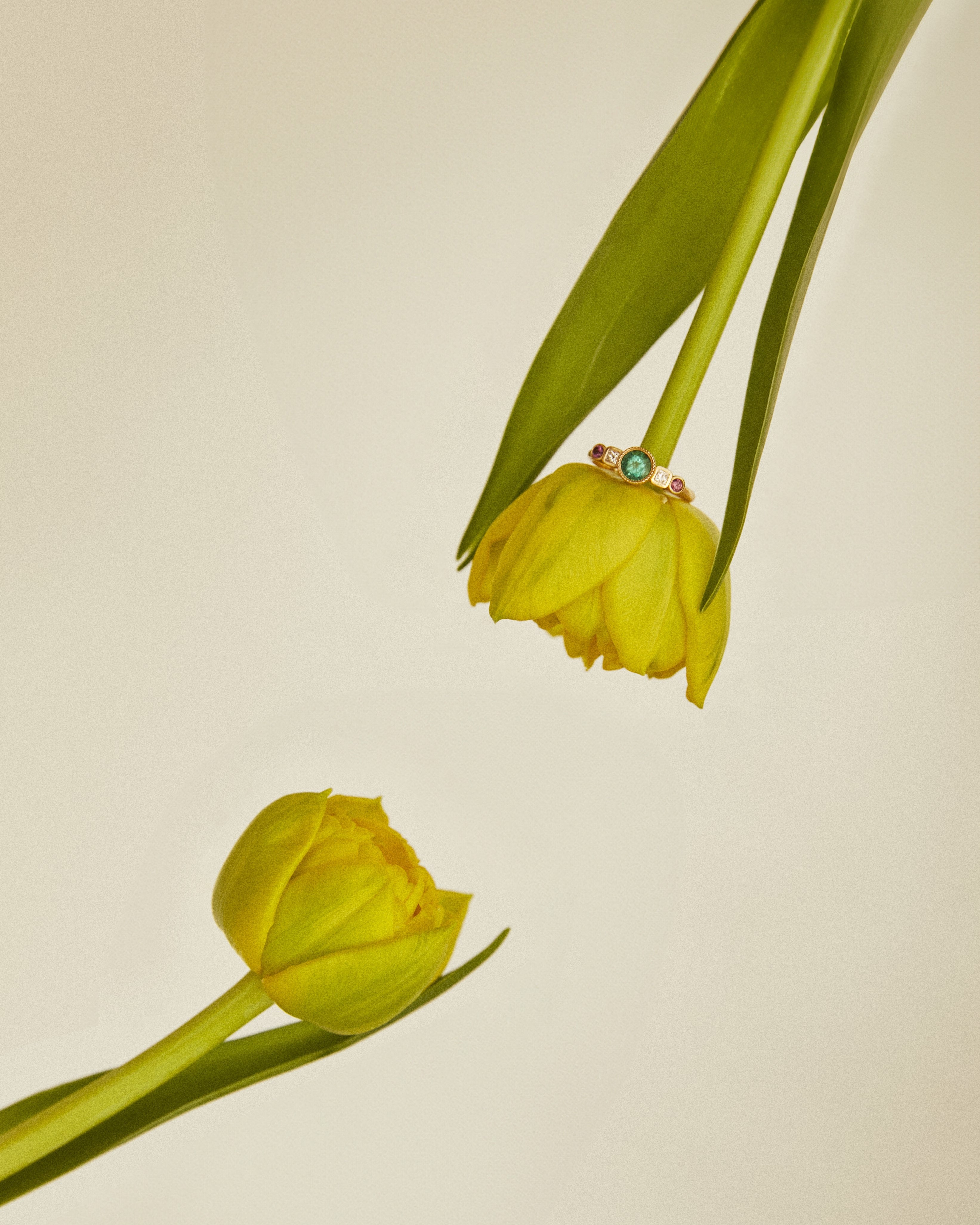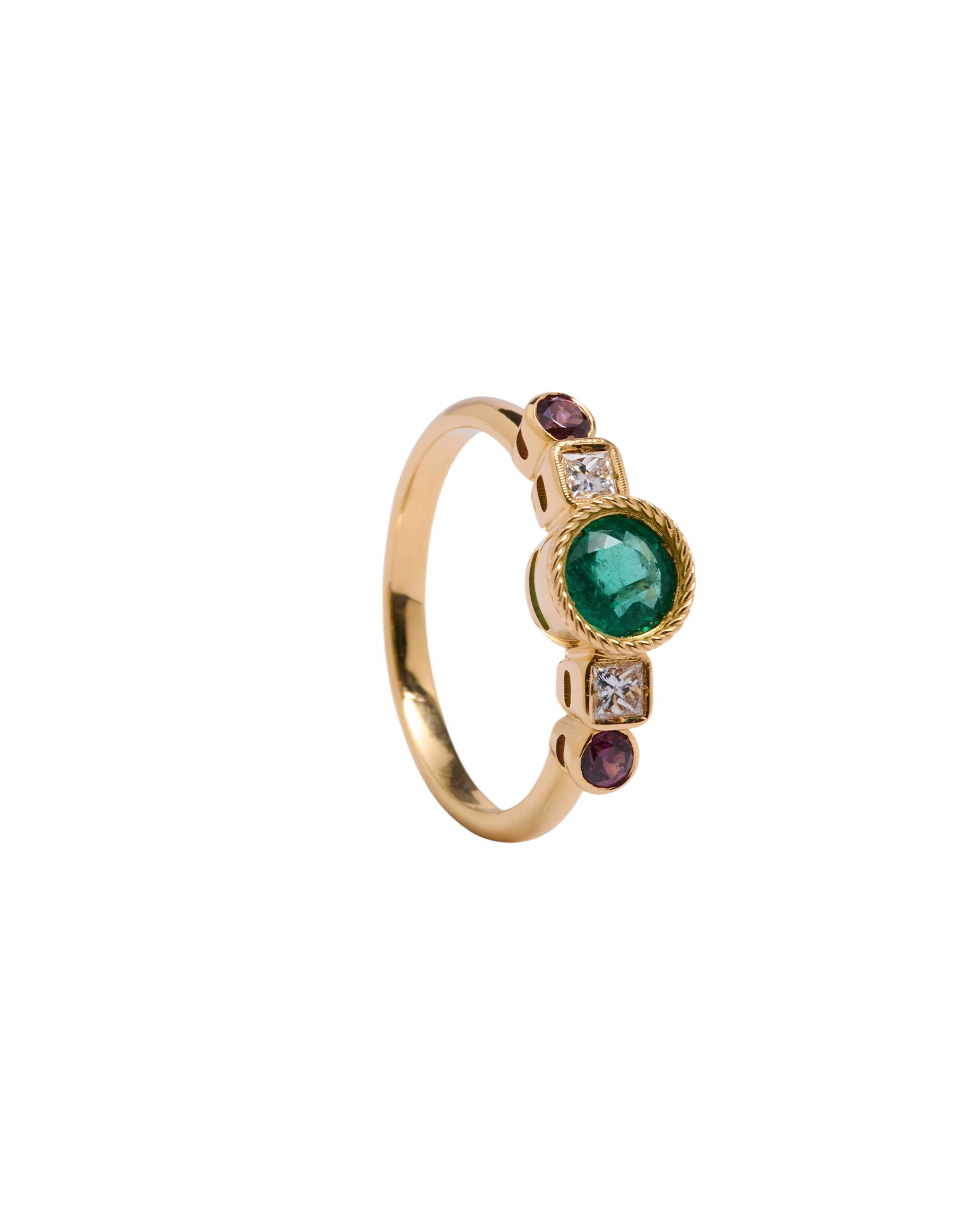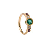The intense green of the emerald links us directly with nature and its power. Its name comes from the Greek word meaning "green stone" and it is one of the four stones classified as precious stones. It is the star of the Frida ring and is accompanied by two diamonds and two rhodolites, from the garnet family. This combination of colours makes this ring an elegant and youthful jewel at the same time.