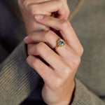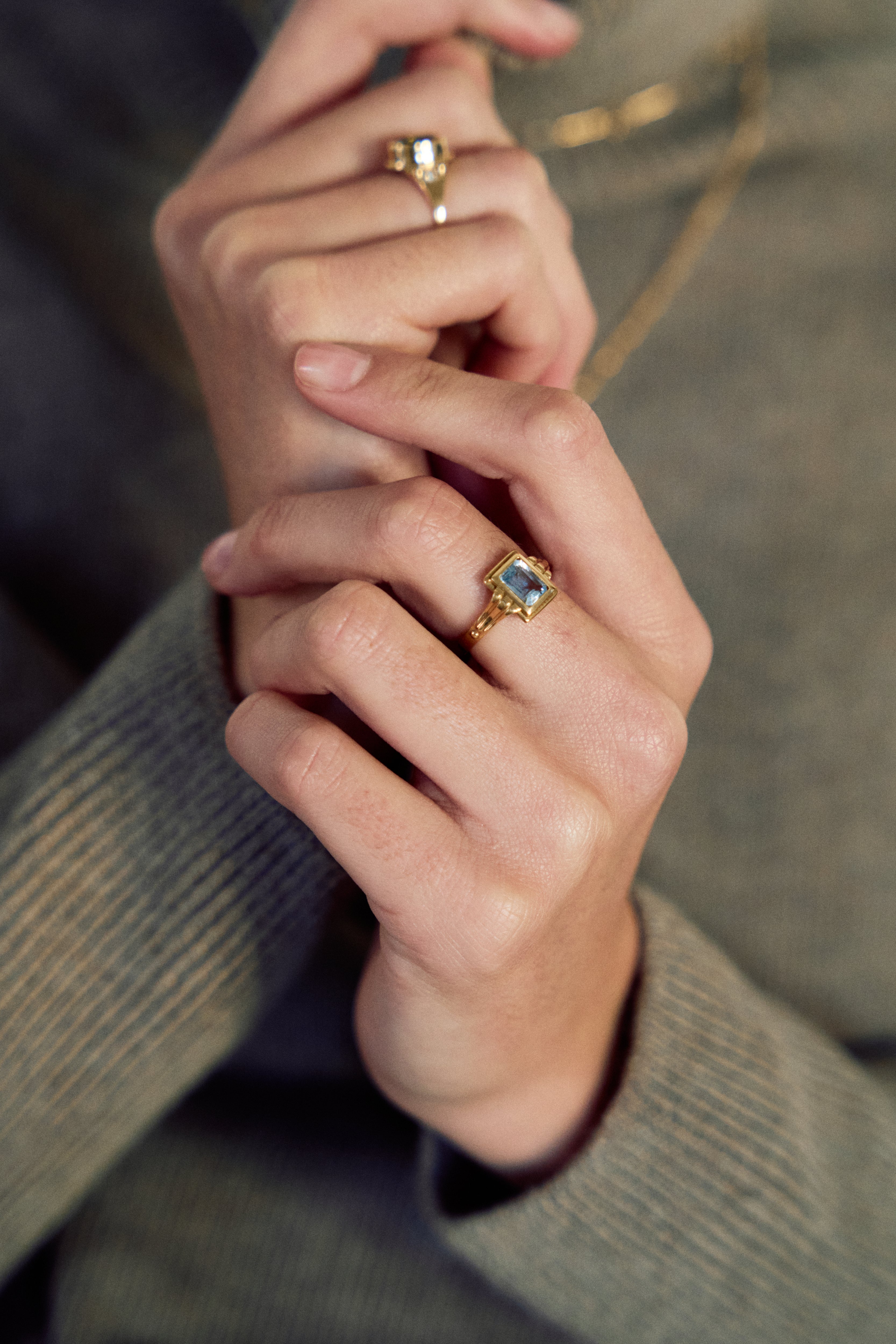 This ring transports us to another era, the aquamarine is the central stone of this piece. This stone is linked to the element of the earth, the energies of inner vision and self-love. It has a great spiritual charge, and its tone transports us to the crystal-clear waters of some magical place.