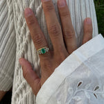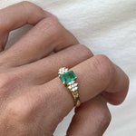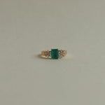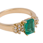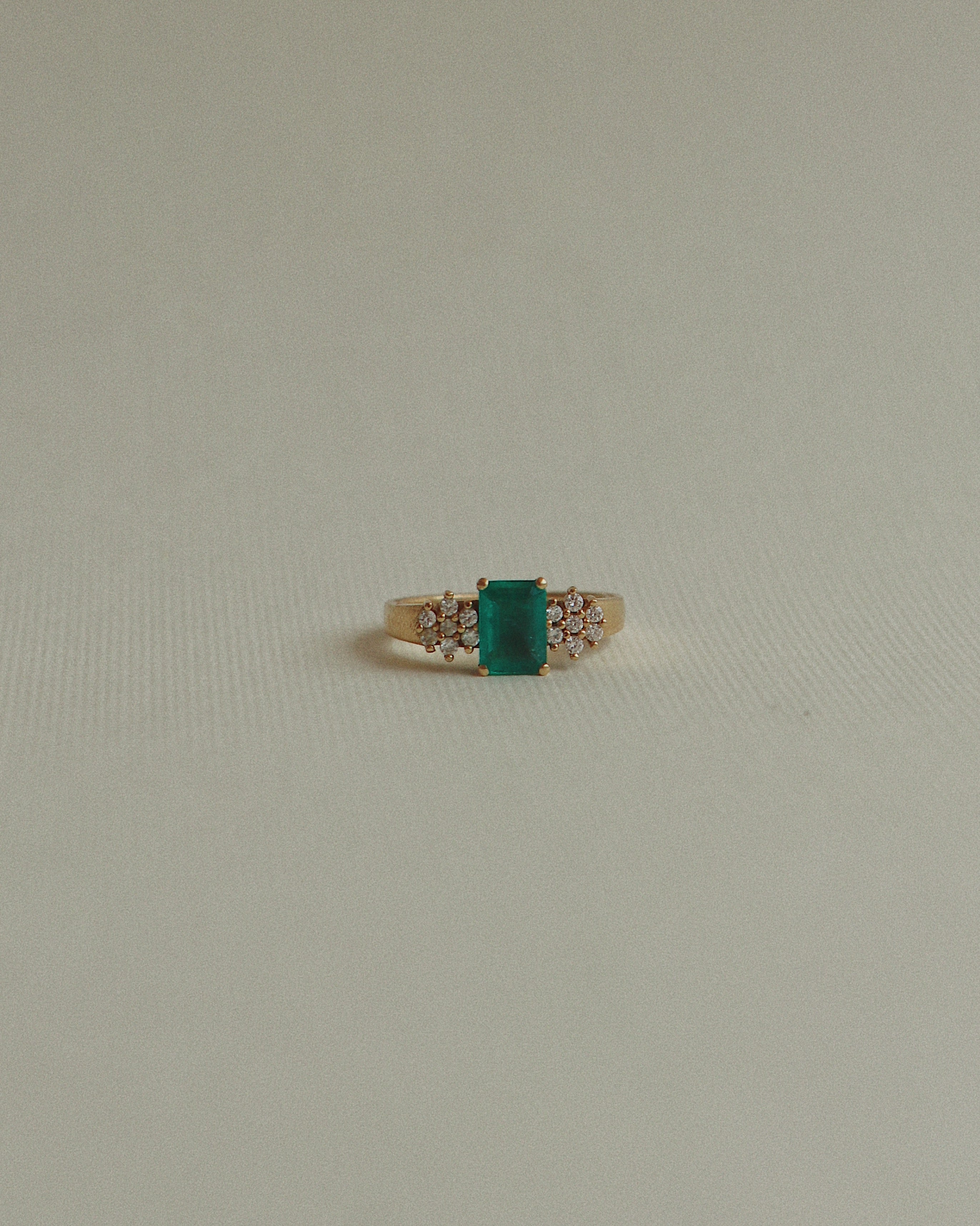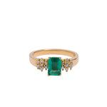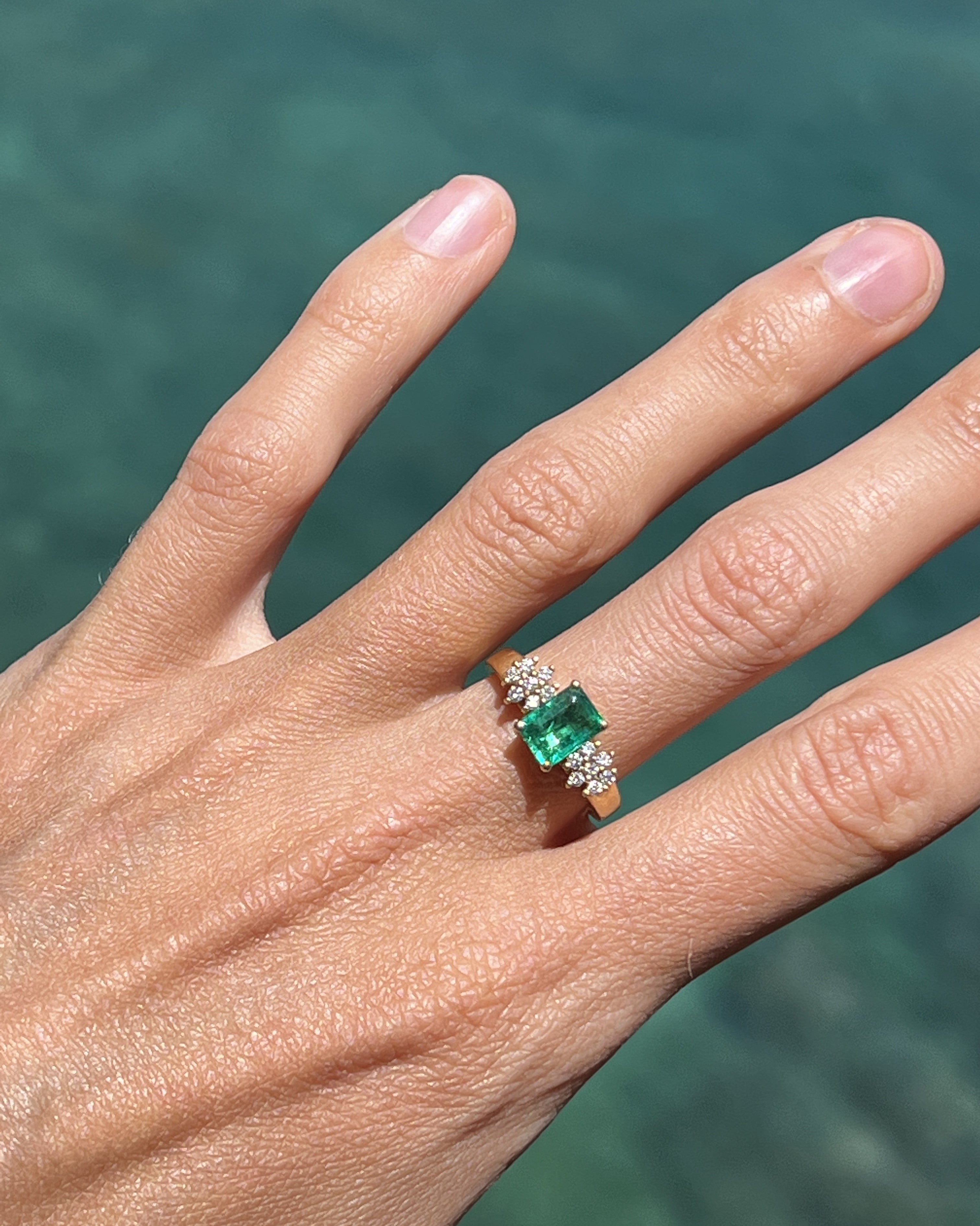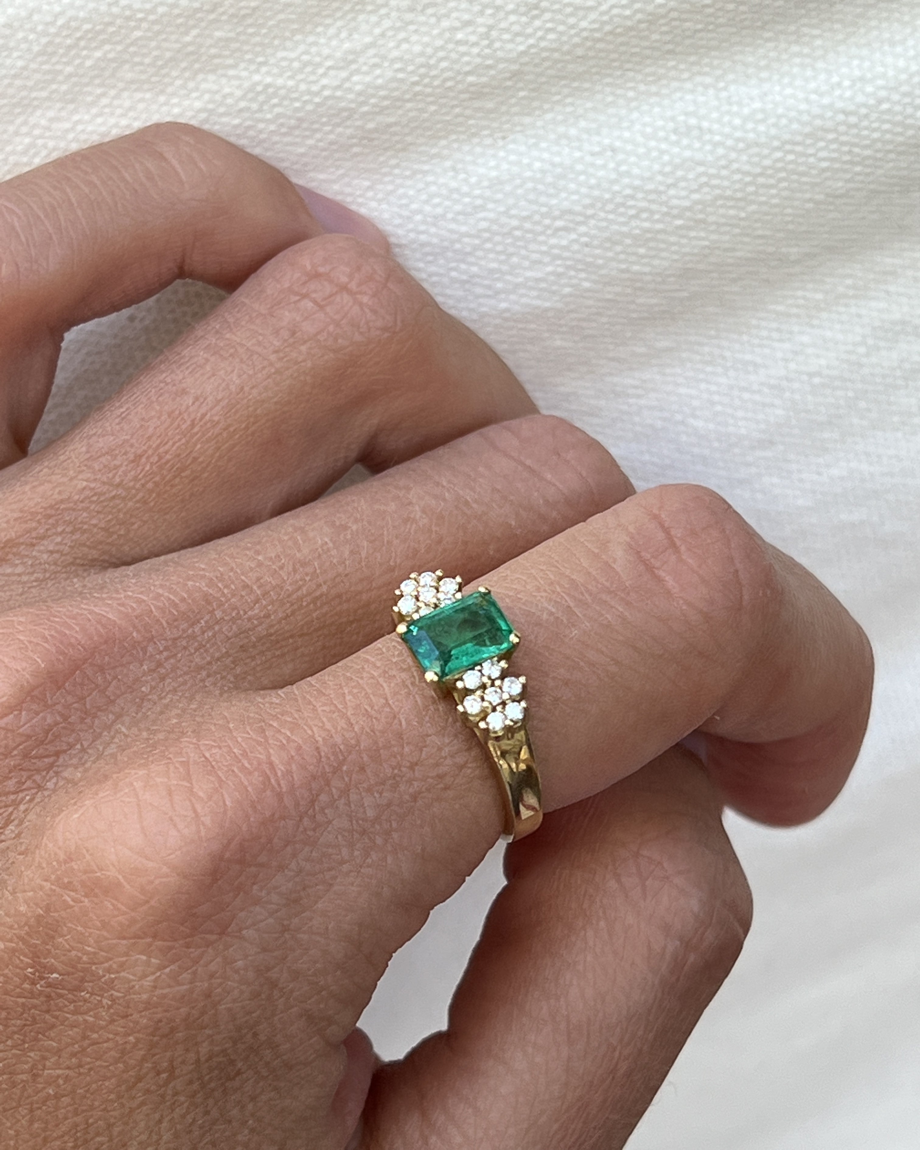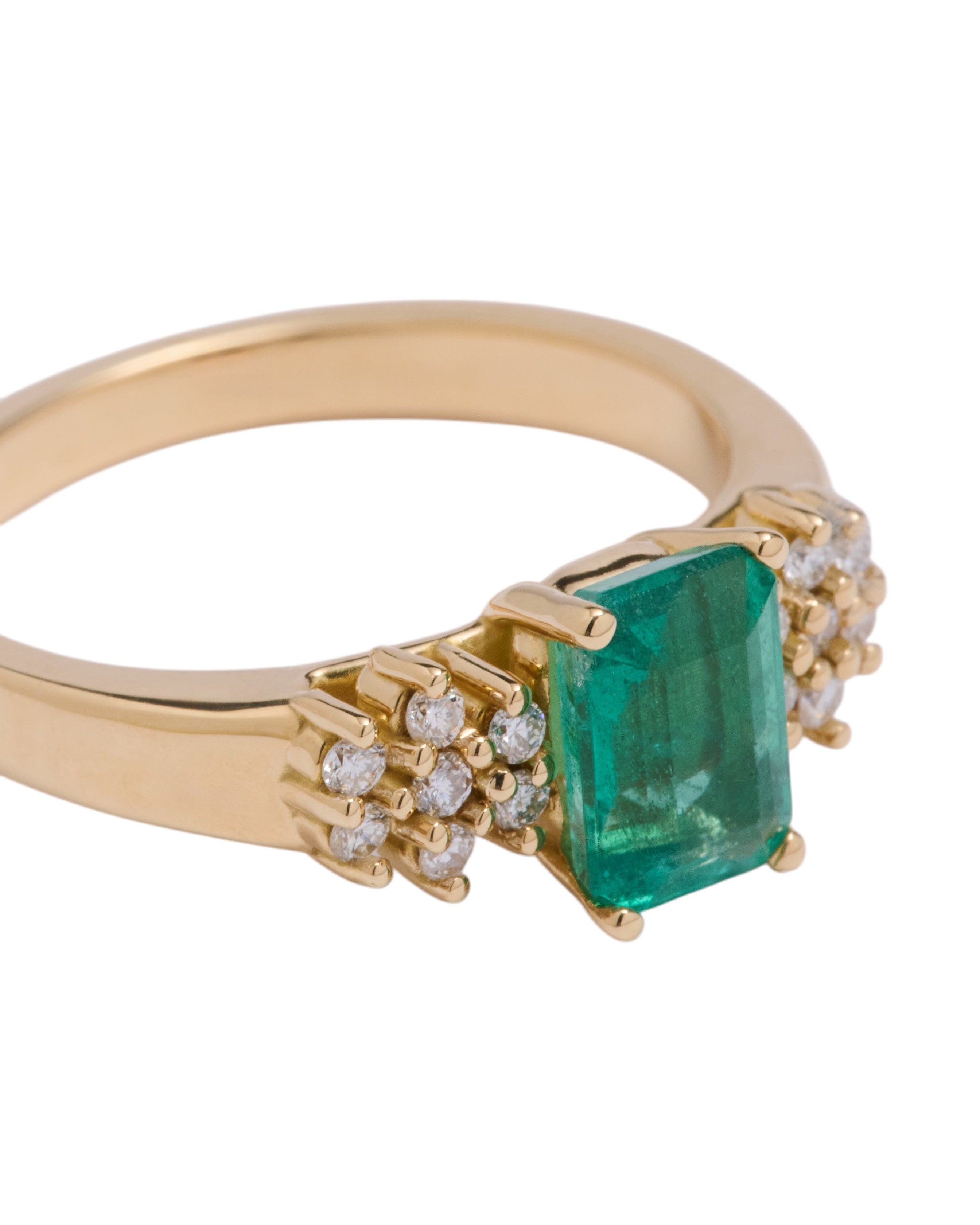 A central octagonal cut emerald of approximately 0.80 carats (7x5mm)