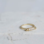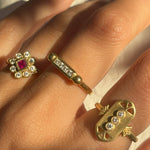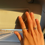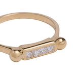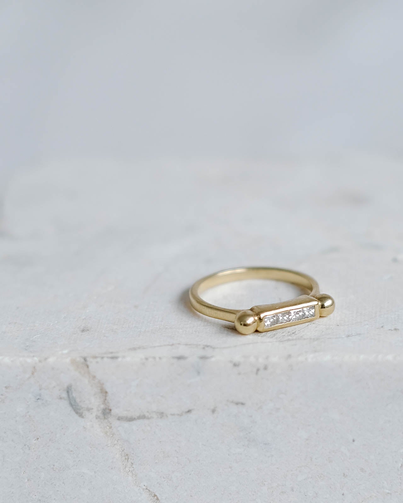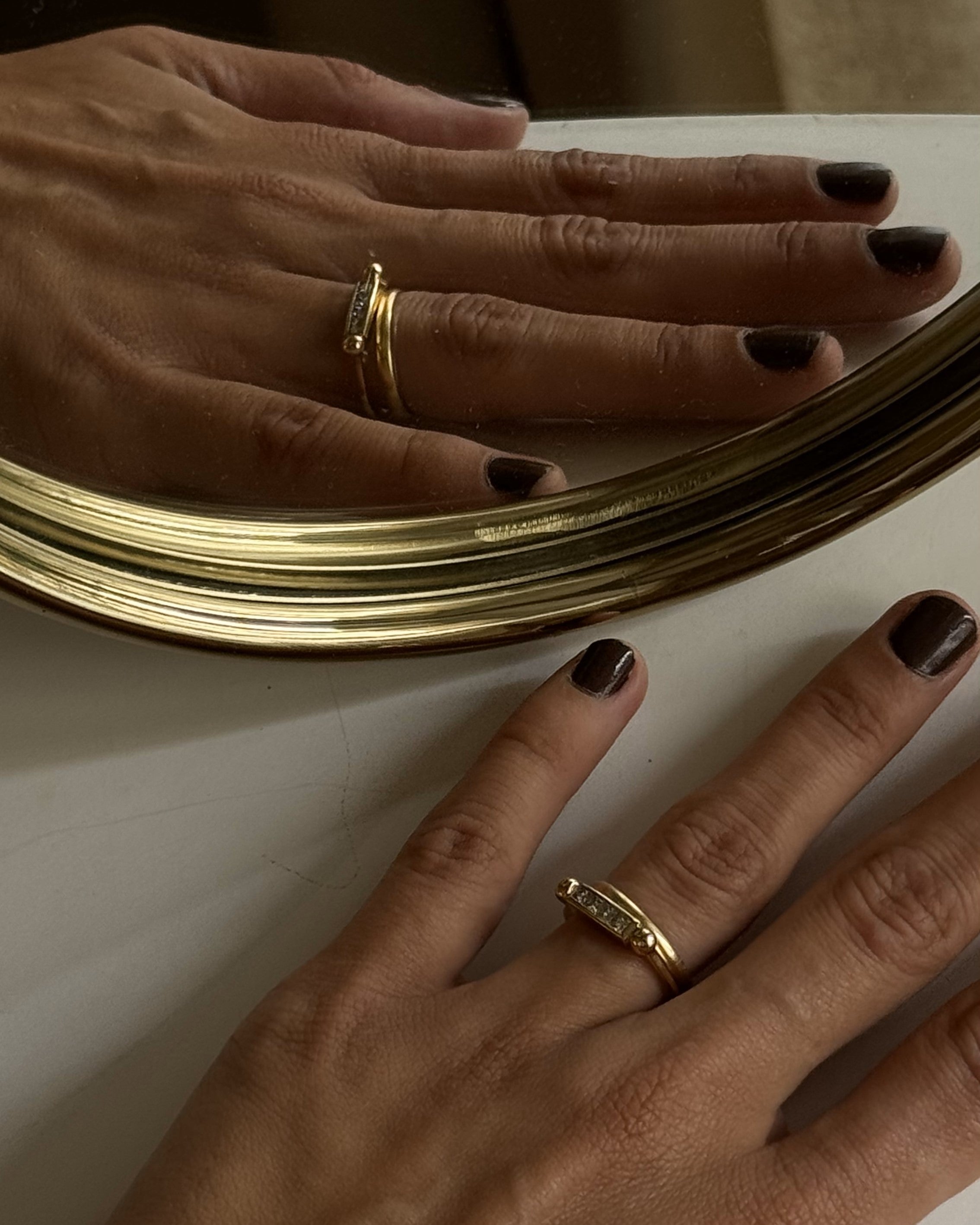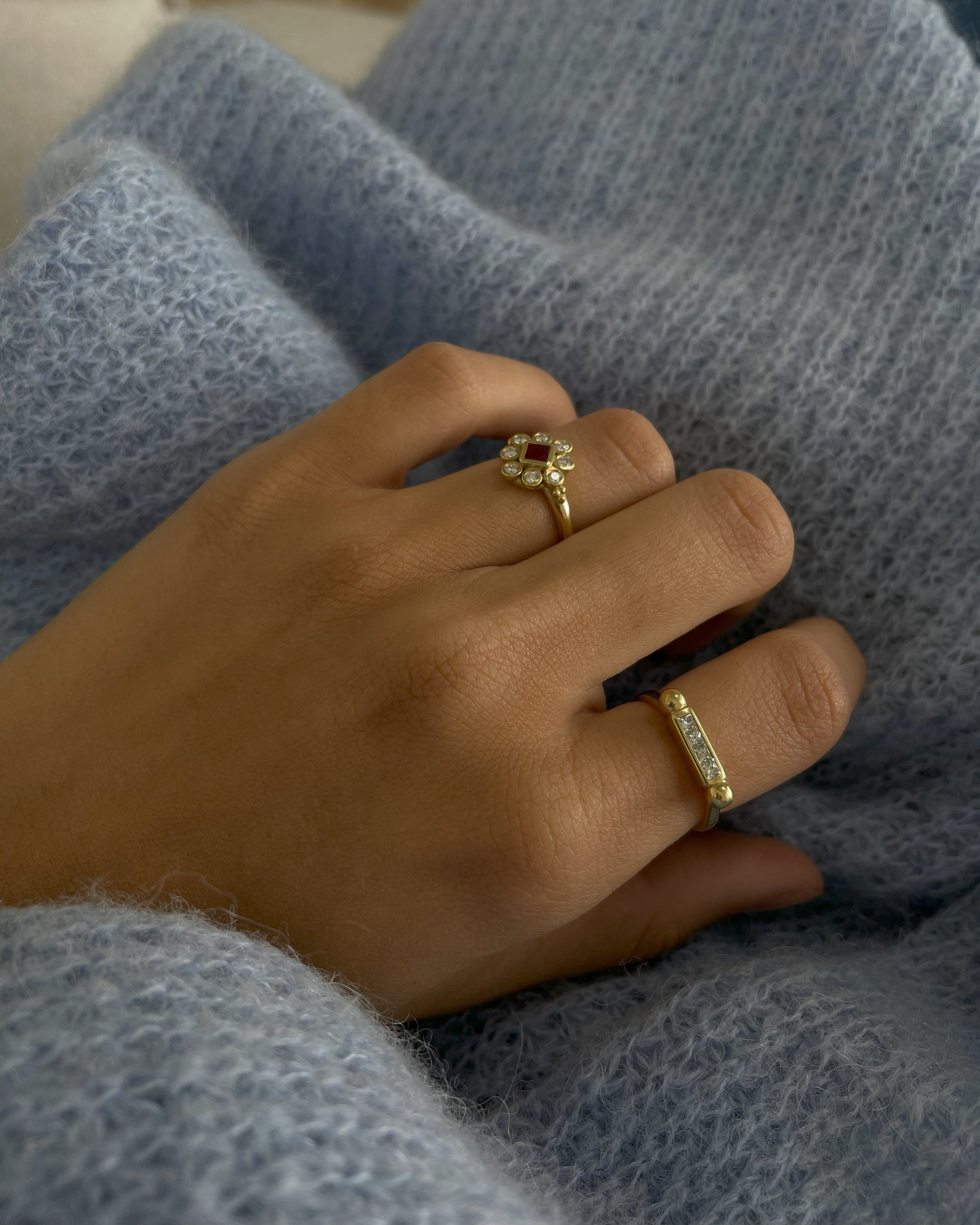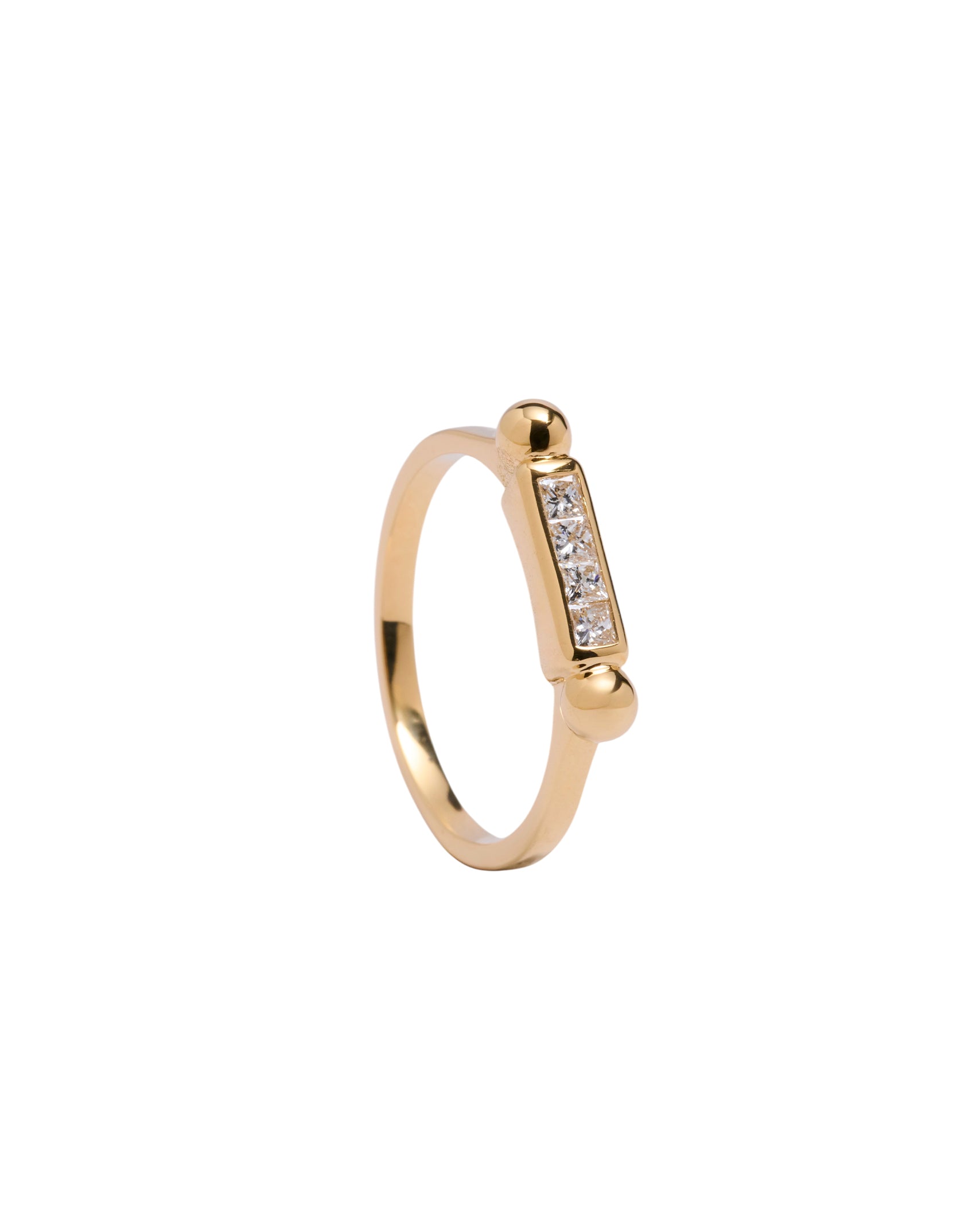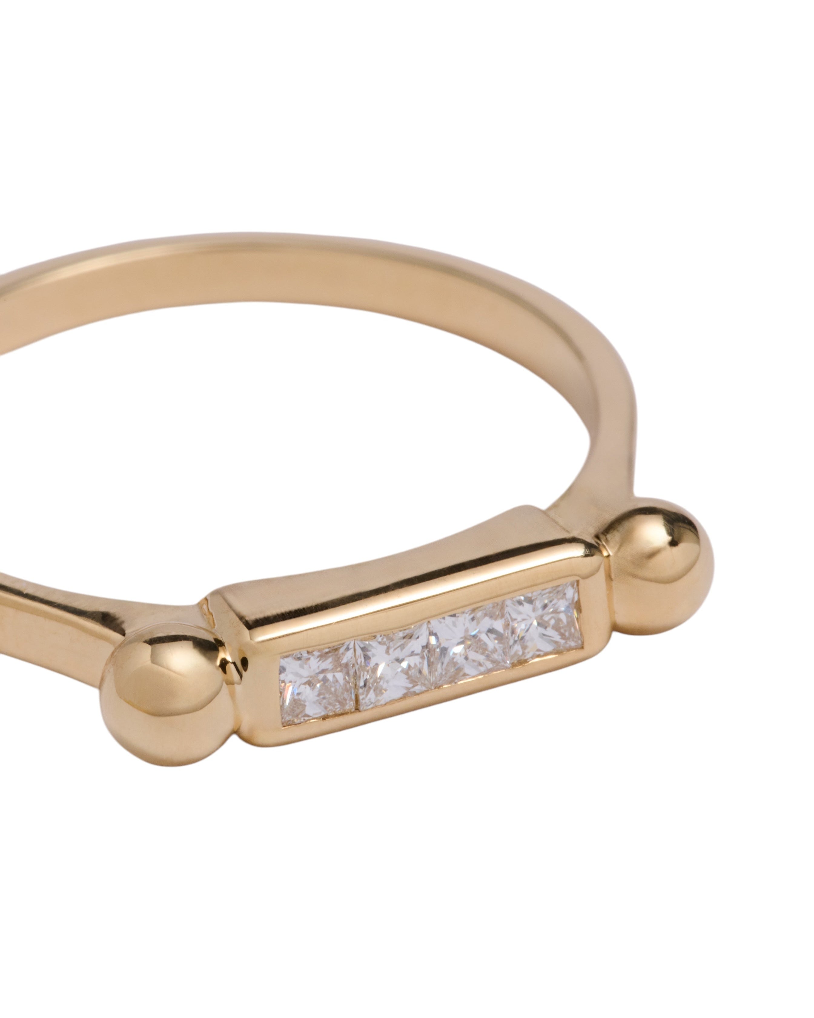 A jewel that combines the elegance of the diamond as the main stone and the creativity and youth of the design that accompanies it. Four princess-cut diamonds framed between two gold spheres. The word diamond comes from the ancient Greek, "adamas" which means, unalterable, indomitable. In other times, the diamond had wonderful virtues against poisons, enchantments and terrors, it calmed anger and preserved love between spouses. The Valentina ring is wonderful to seal a great love, and tell an eternal story.