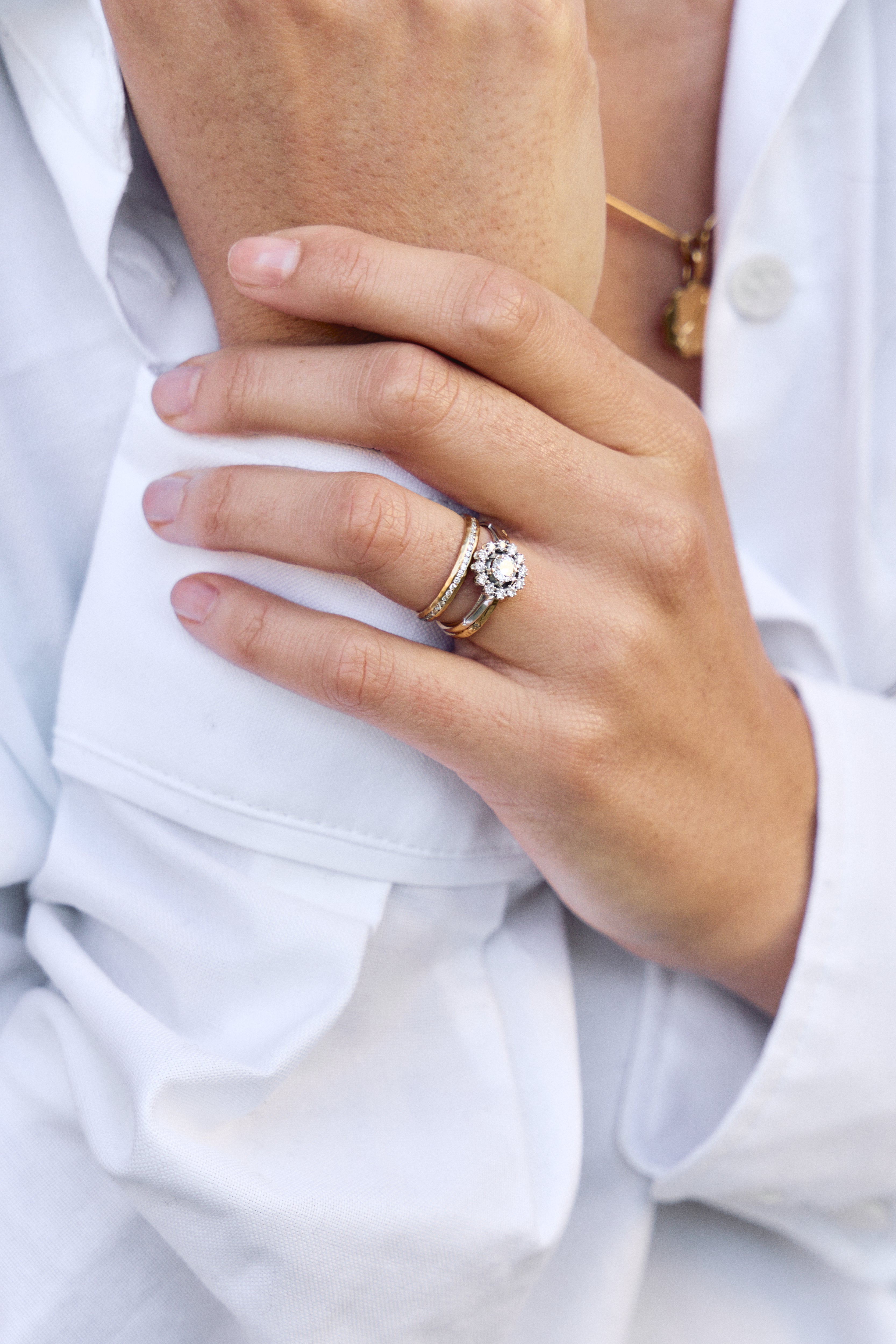 A design that takes us back to another era. With a brilliant-cut central diamond, the star stone of this piece, surrounded by 17 brilliants and 6 sapphires of an intense blue, like that of the deep seas. This jewel shines with its elegance and is, for us, a piece designed to immortalize an eternal commitment.