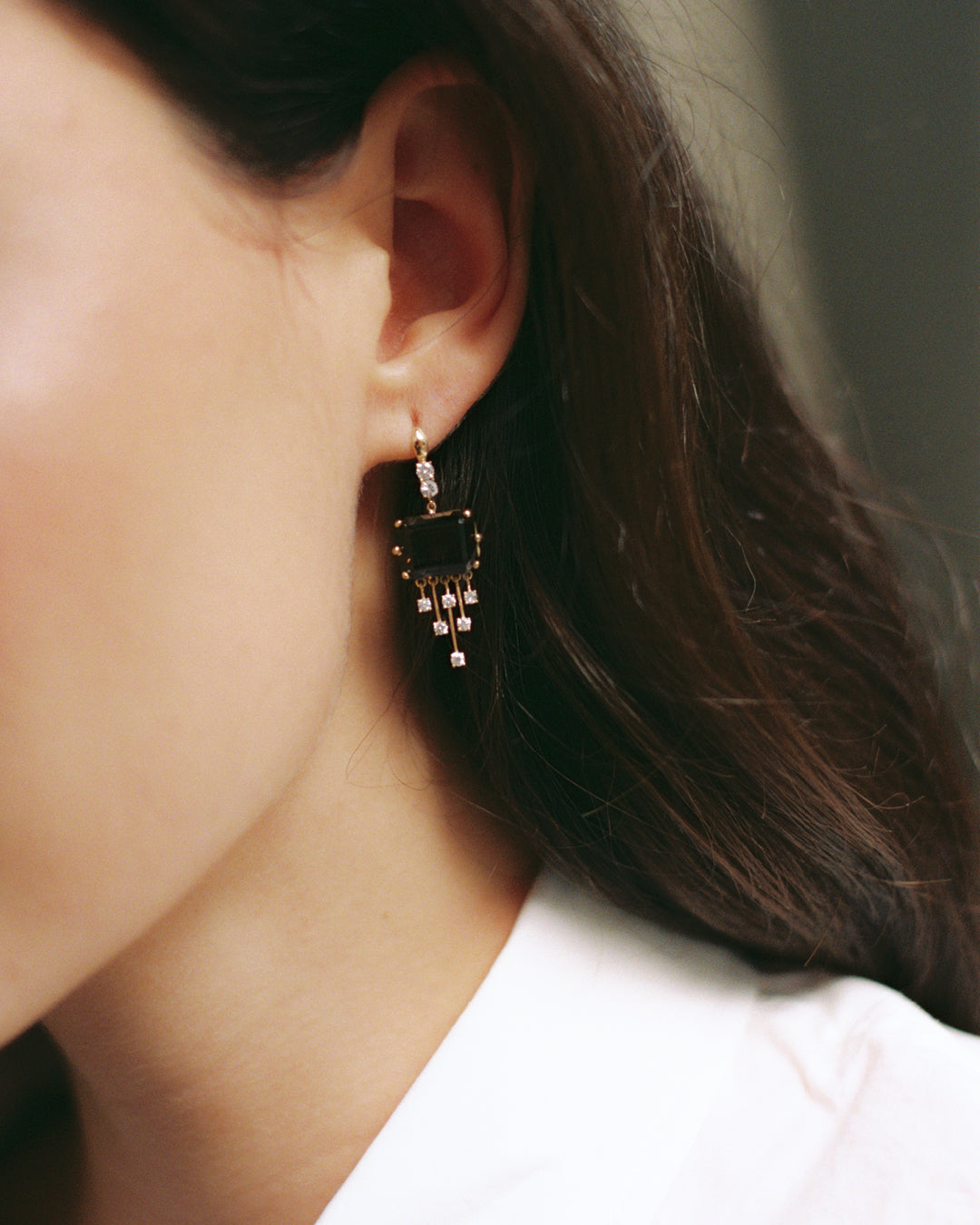 Un diseño original y lleno de movimiento. La piedra protagonista es un cuarzo ahumado engastado en garras, del que nace una cascada de diamantes dispuestos en forma de racimo. Este diseño combina la sobriedad de lo moderno con la ligereza de la cascada de diamantes en movimiento.