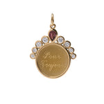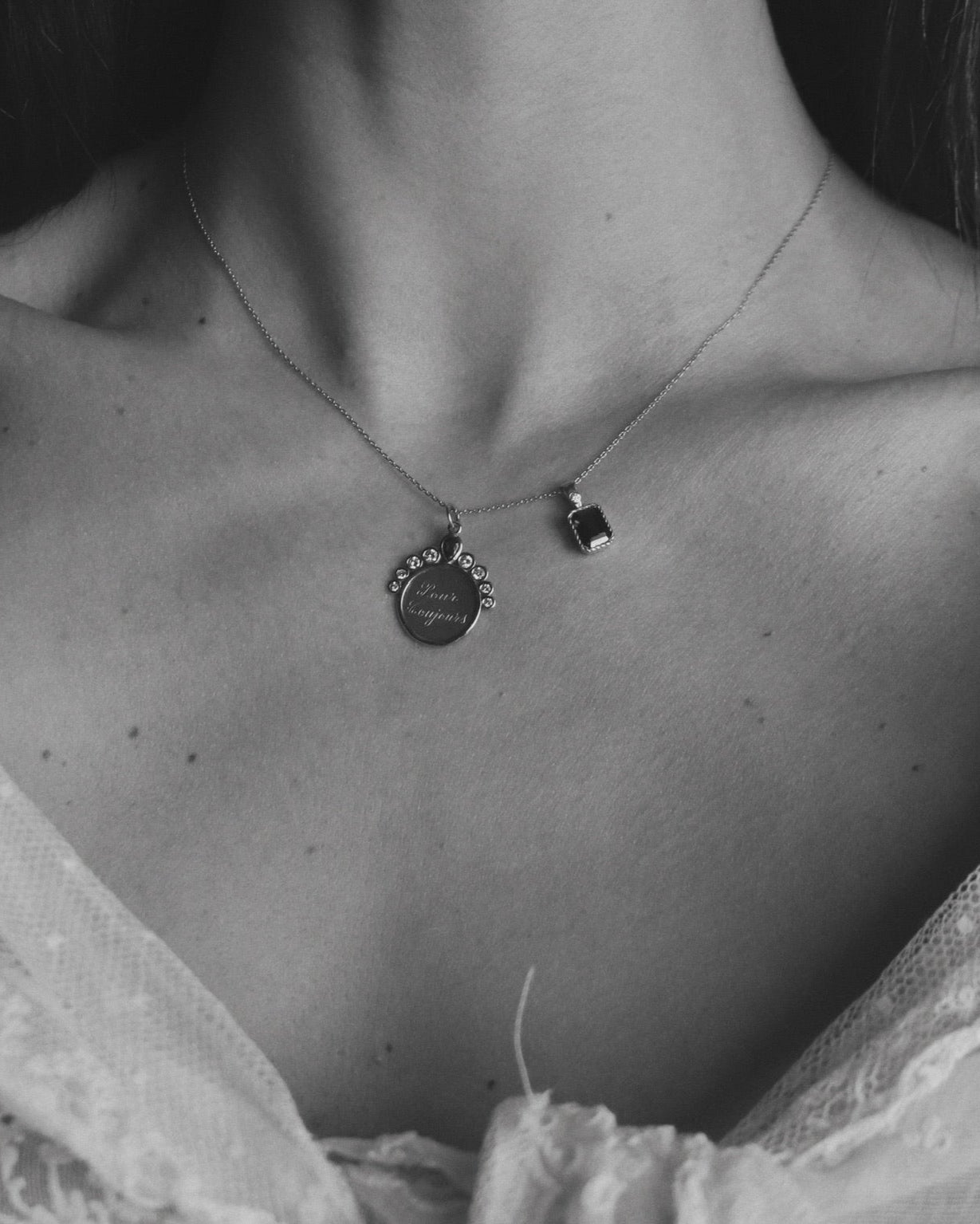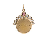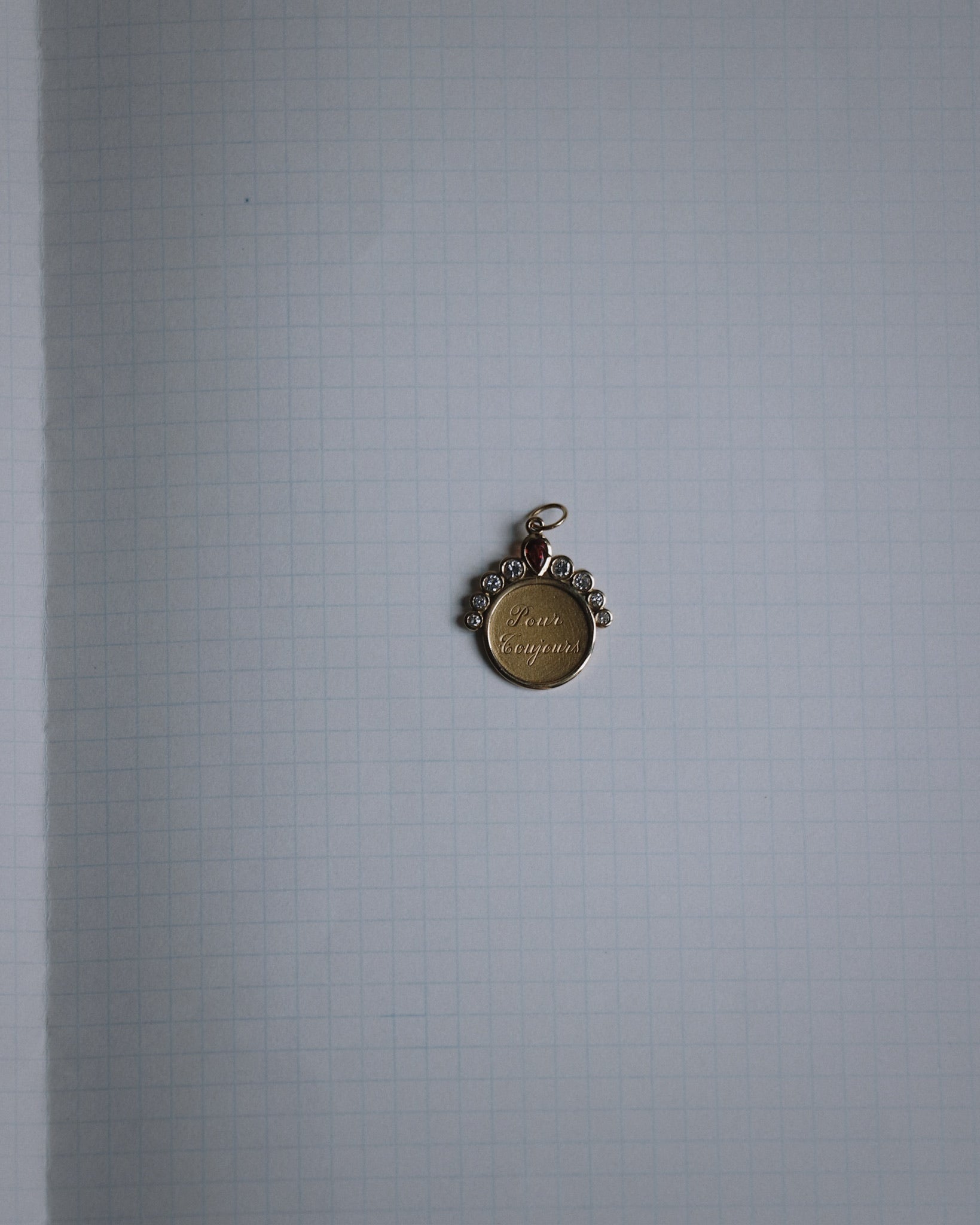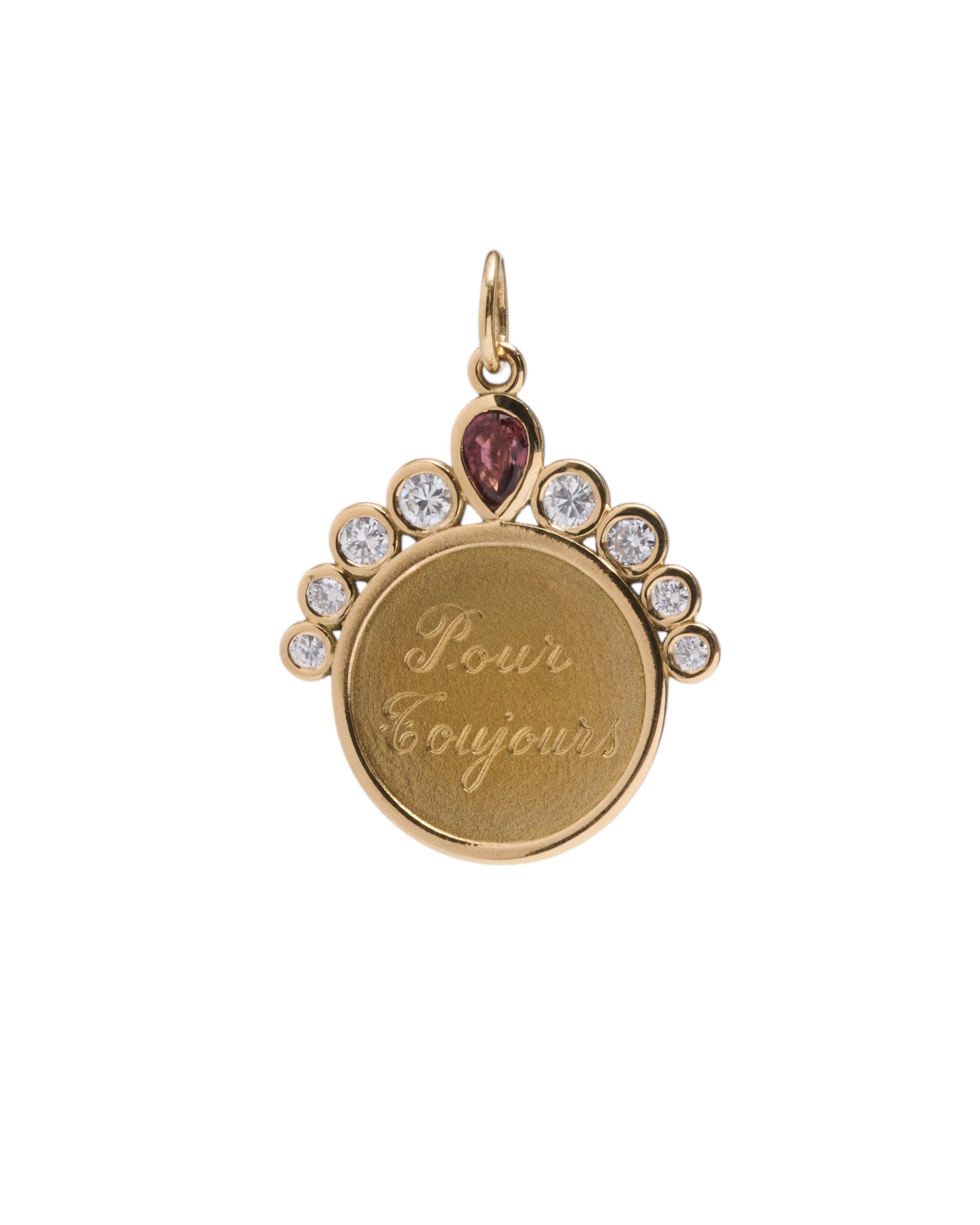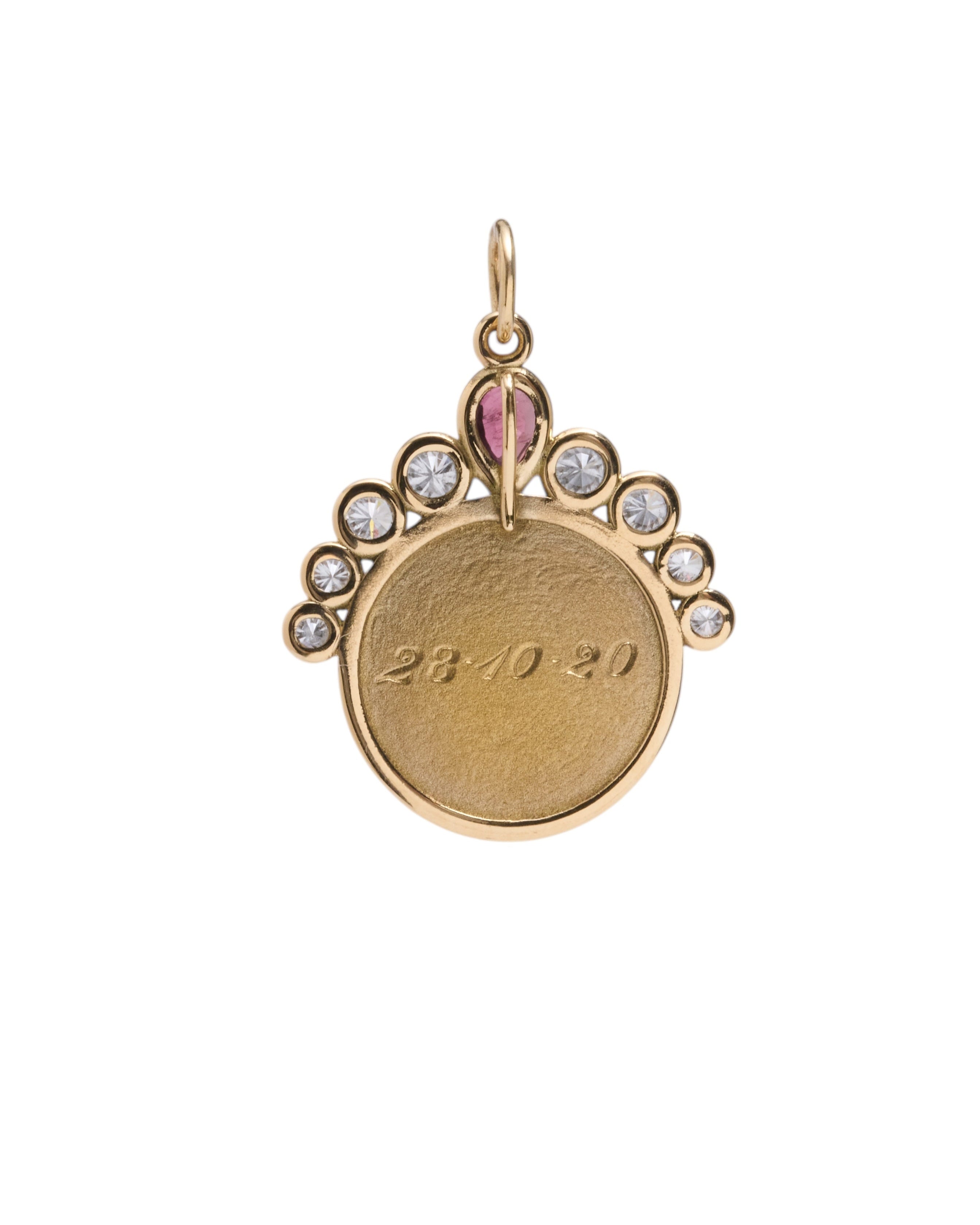 Esta medalla es especial porque sella un amor eterno, una historia por escribir, algo que está grabado a fuego en ti y quieres que te acompañe siempre, una fecha, un nombre, un recuerdo, una corona de diamantes con una rodolita en forma de gota son el color y la luz de esta joya.