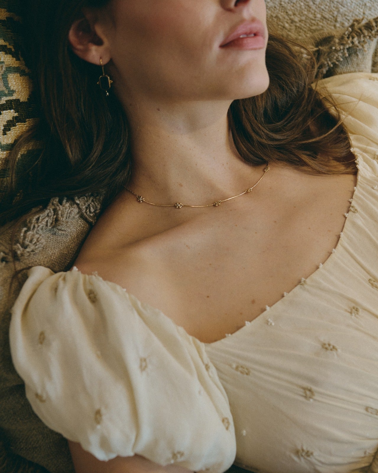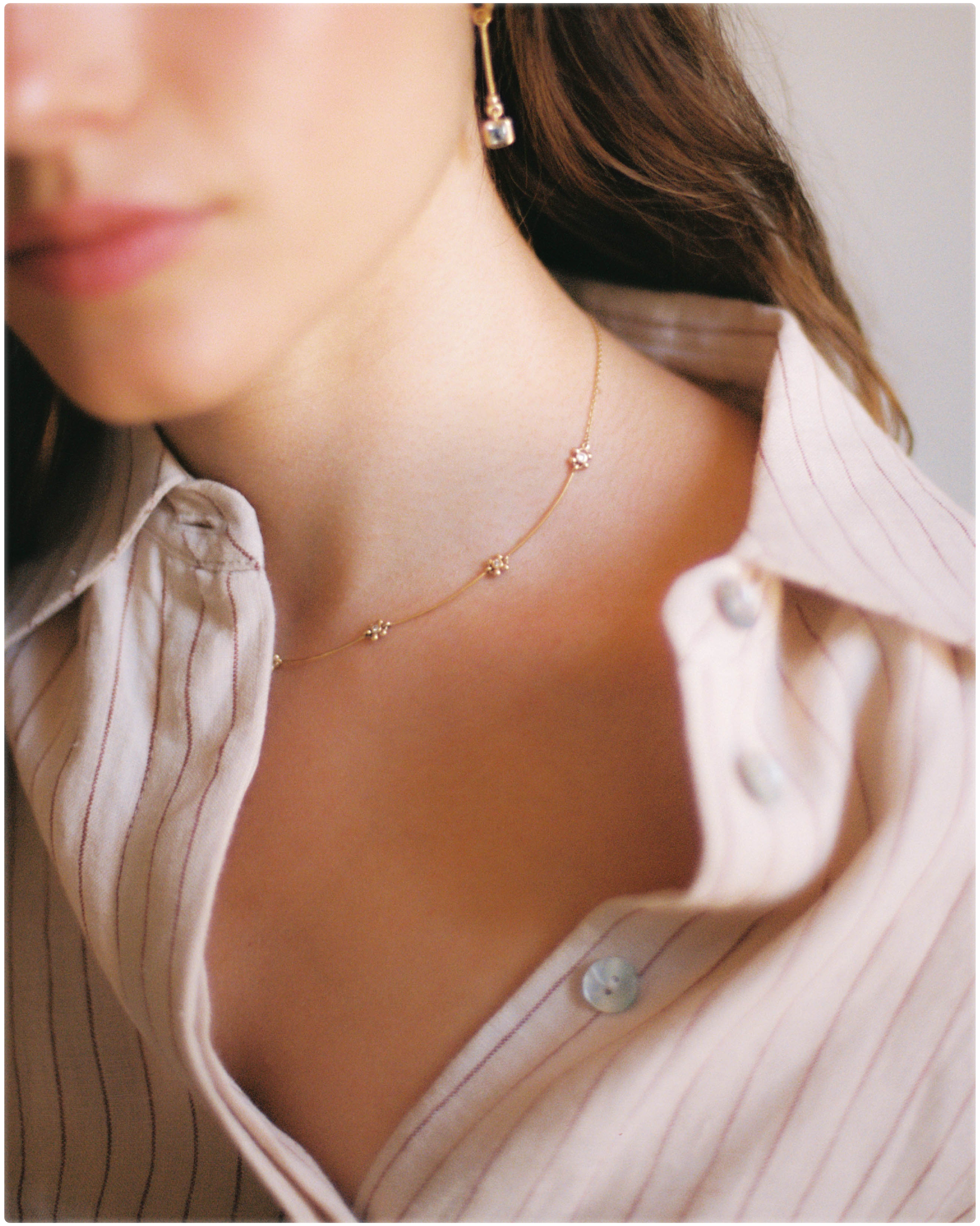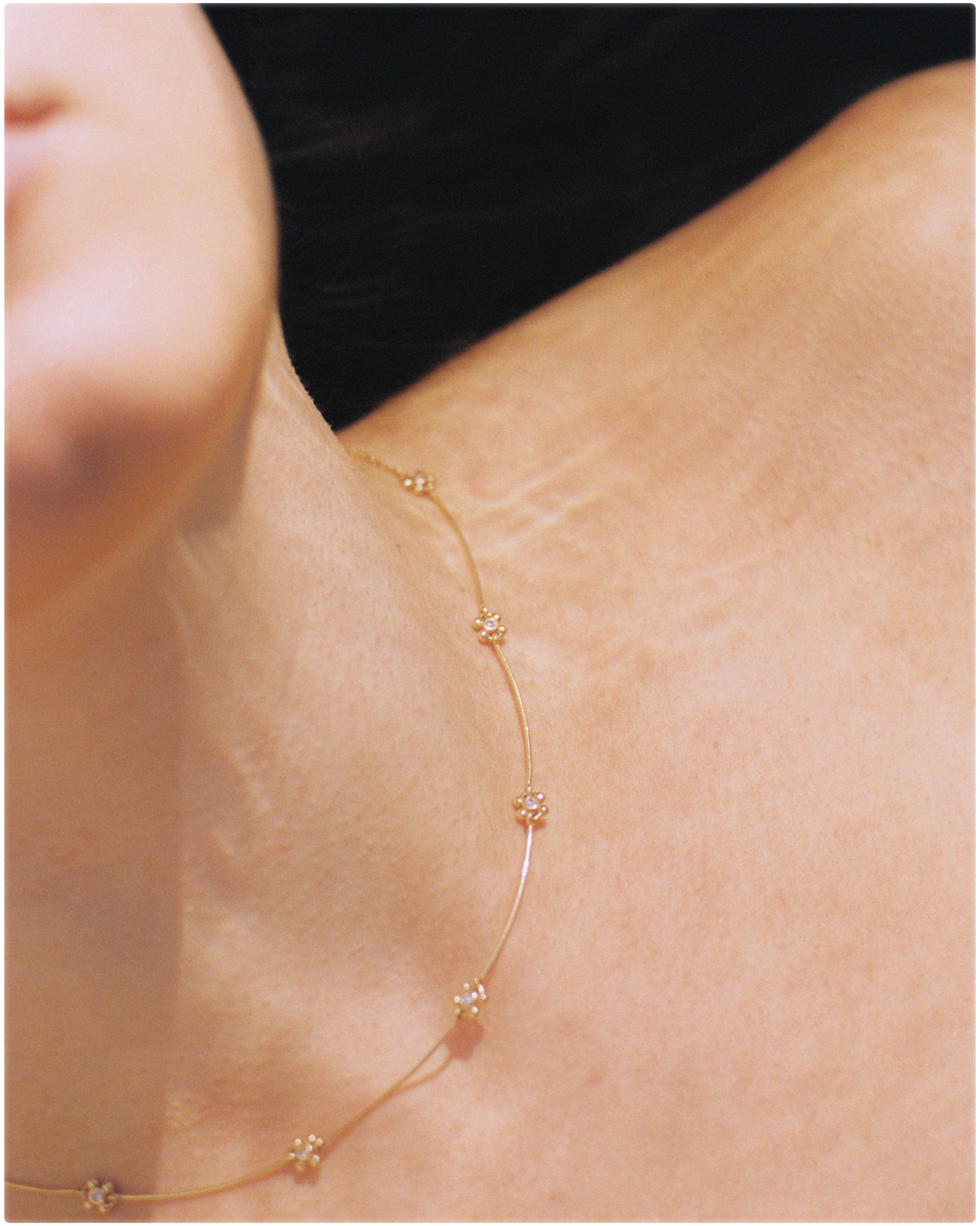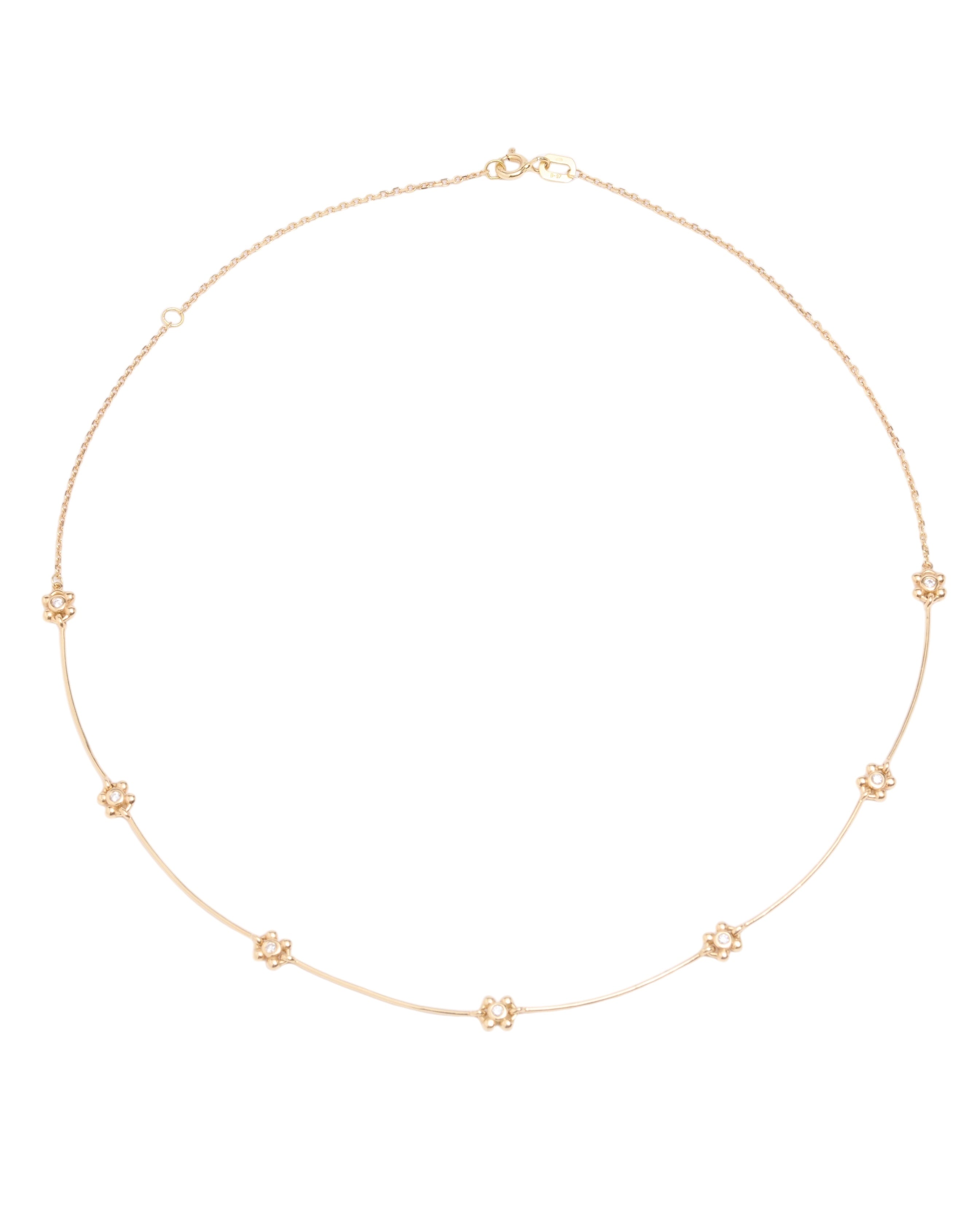 La delicadeza de esta pieza es lo que la hace única, hechas a mano una a una, estas barritas de oro amarillo de 18kt que se entrelazan, casi cosidas a mano, con pequeñas flores y con un diamante central, un collar fino, que brilla por su ligereza.