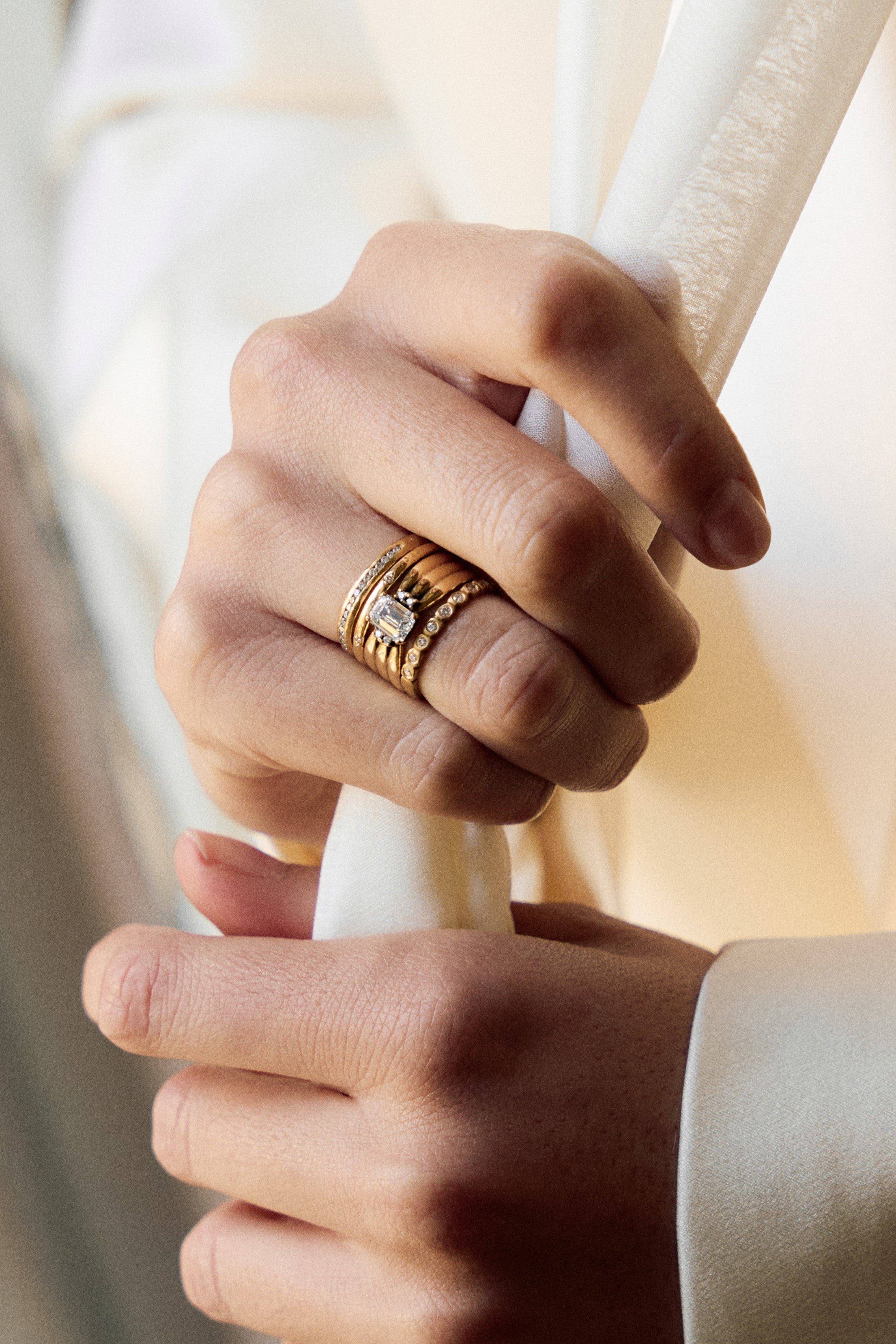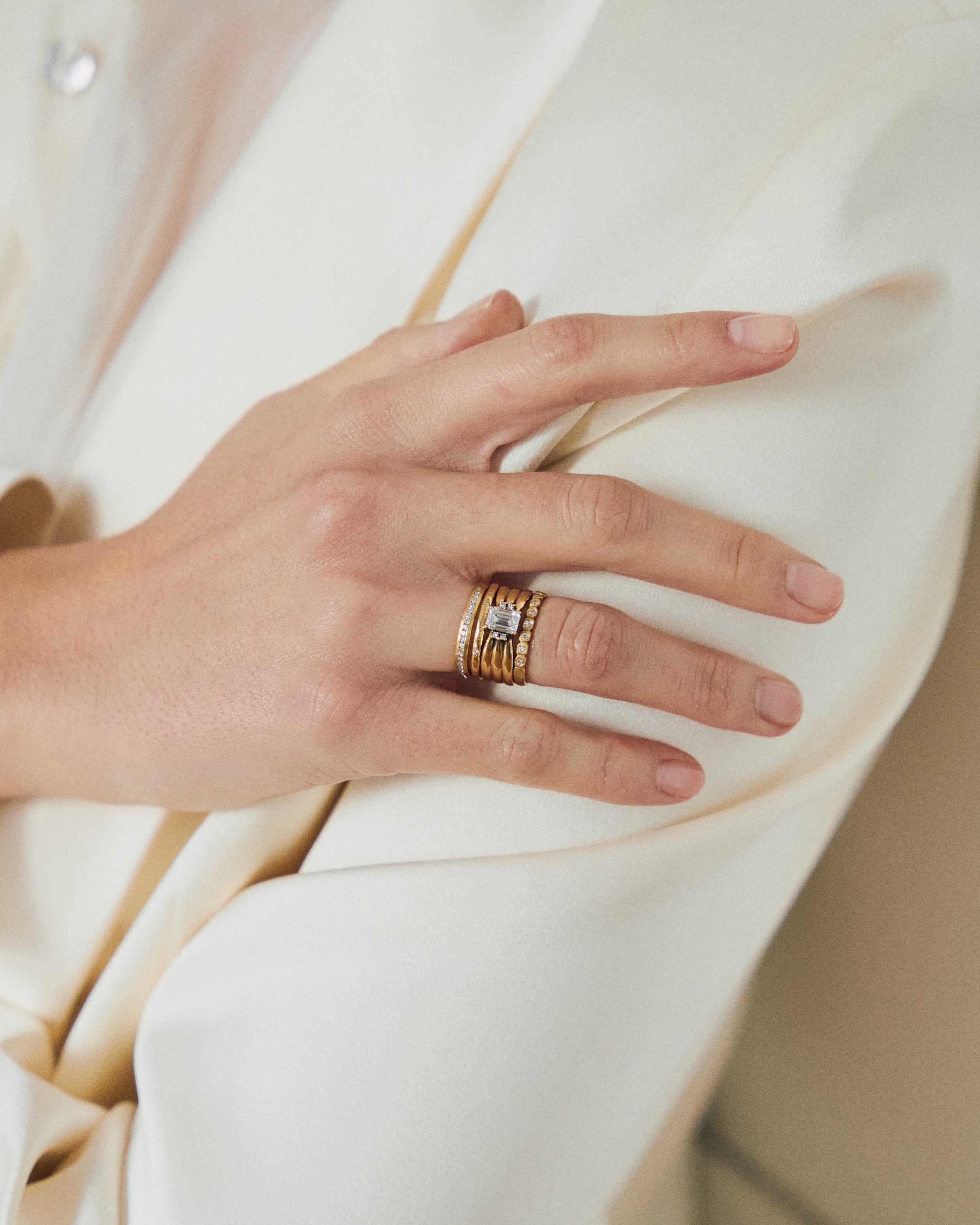 Una sortija llena de delicadeza, una fina banda de oro que abraza una hilera de diamantes. Este diseño es ideal para llevarlo acompañado y complementar otras sortijas, pero también para llevarlo en el día a día como una sortija fina y delicada. Una joya hecha para acompañarte siempre, con la suavidad de algo eterno.