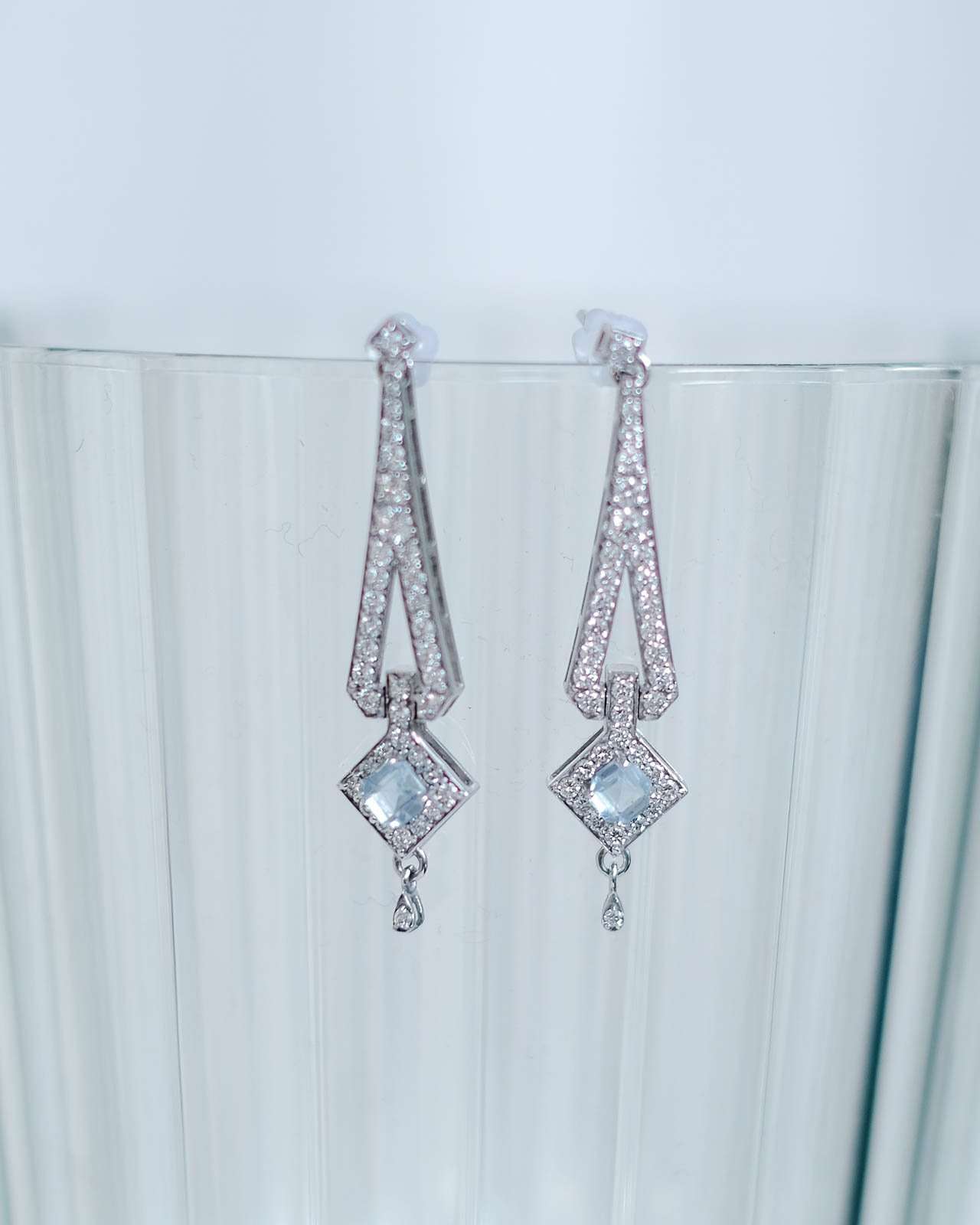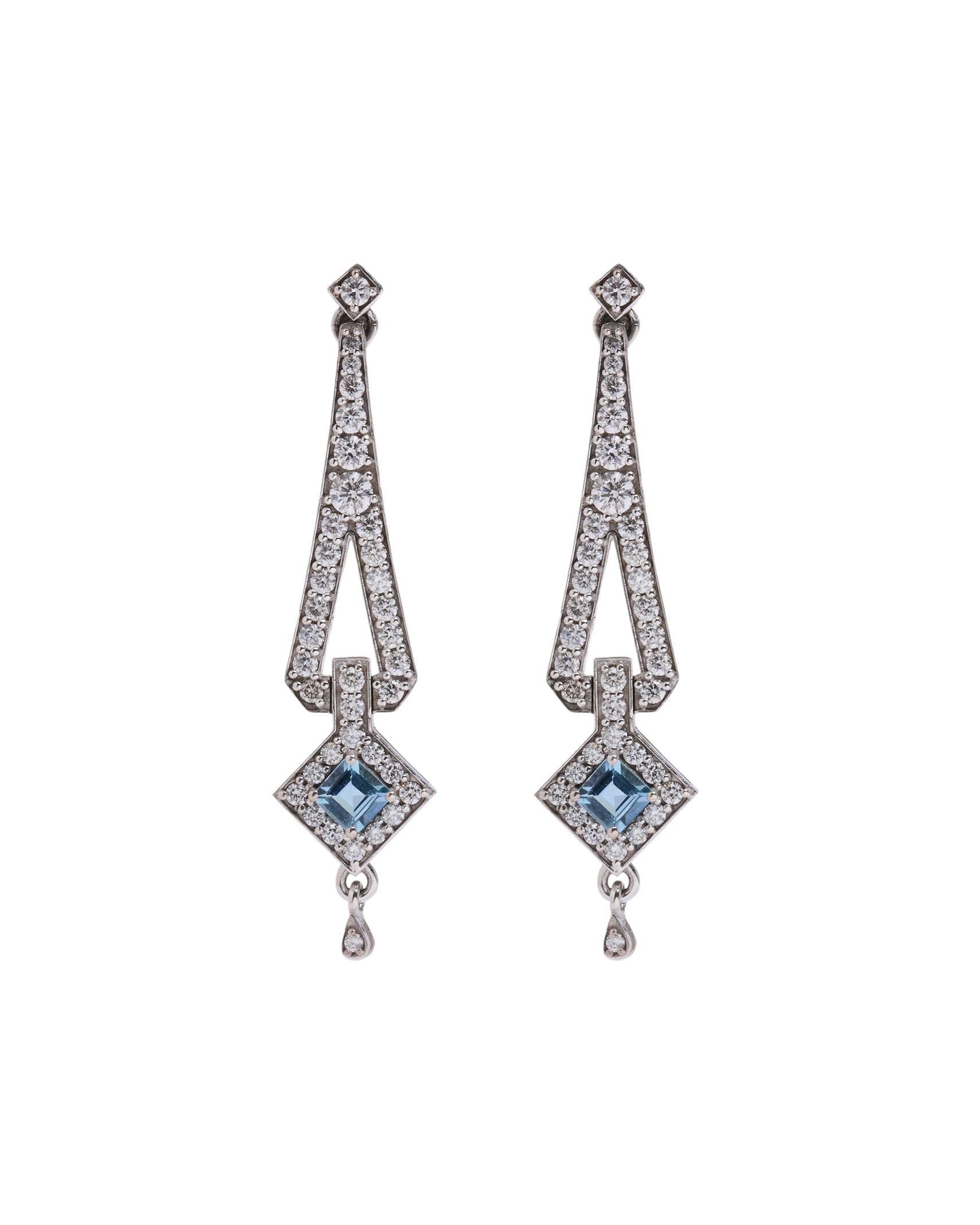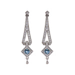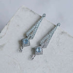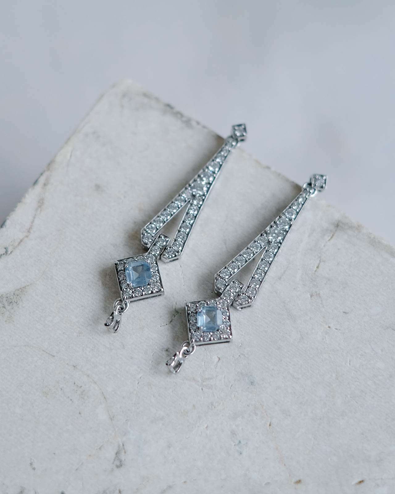 Nuestra pieza estrella en oro blanco, estos pendientes están inspirados en la época de Art Deco, en esta época la inspiración venía de la Bauhaus, pero también había una gran influencia del mundo arqueológico, en concreto de la joyería egipcia faraónica. La aguamarina es la piedra principal de esta pieza, aunque como en las joyas art deco, los diamantes acompañan todo el contorno de la joya. La aguamarina es la piedra del coraje, y ayuda a calmar la mente.