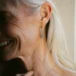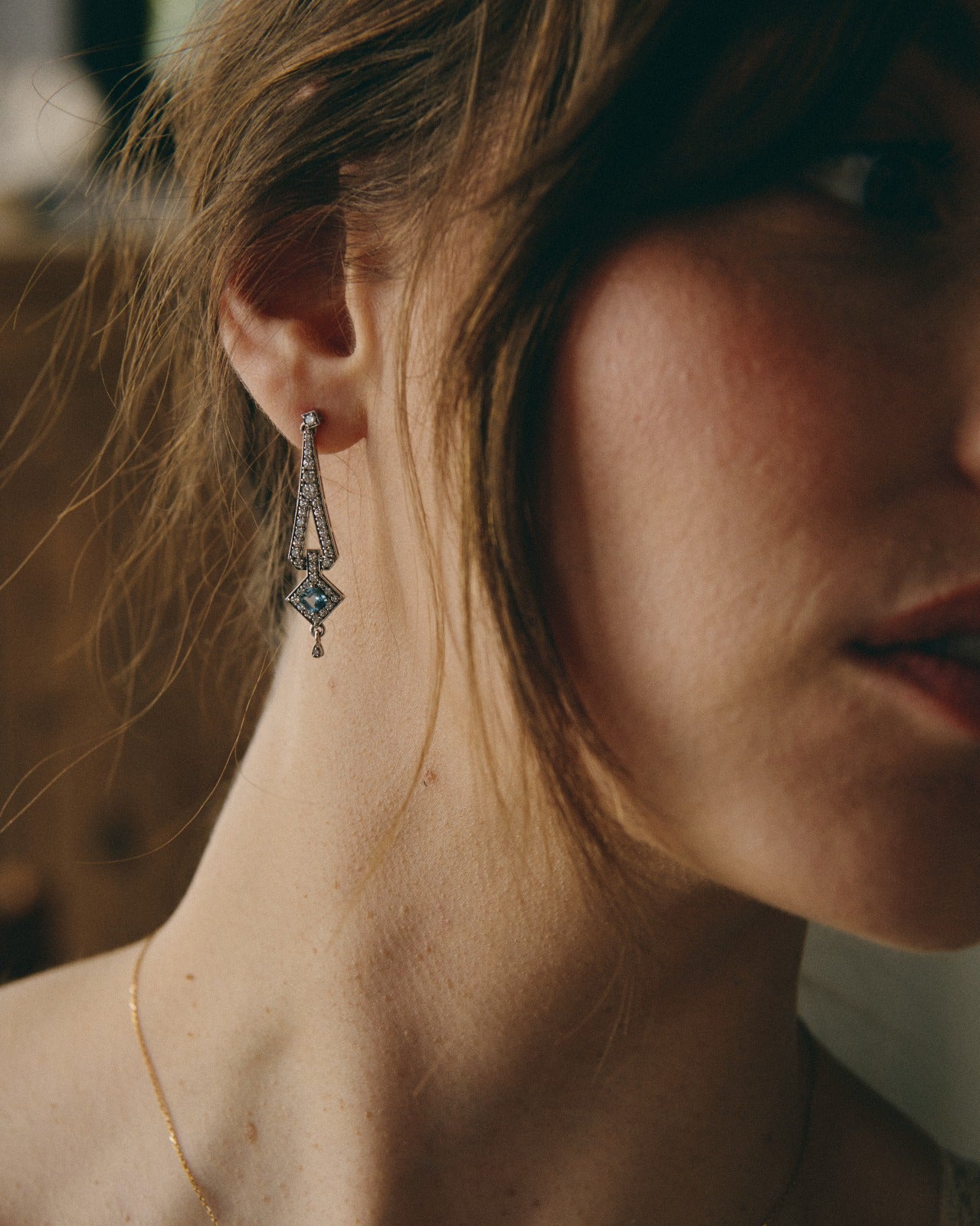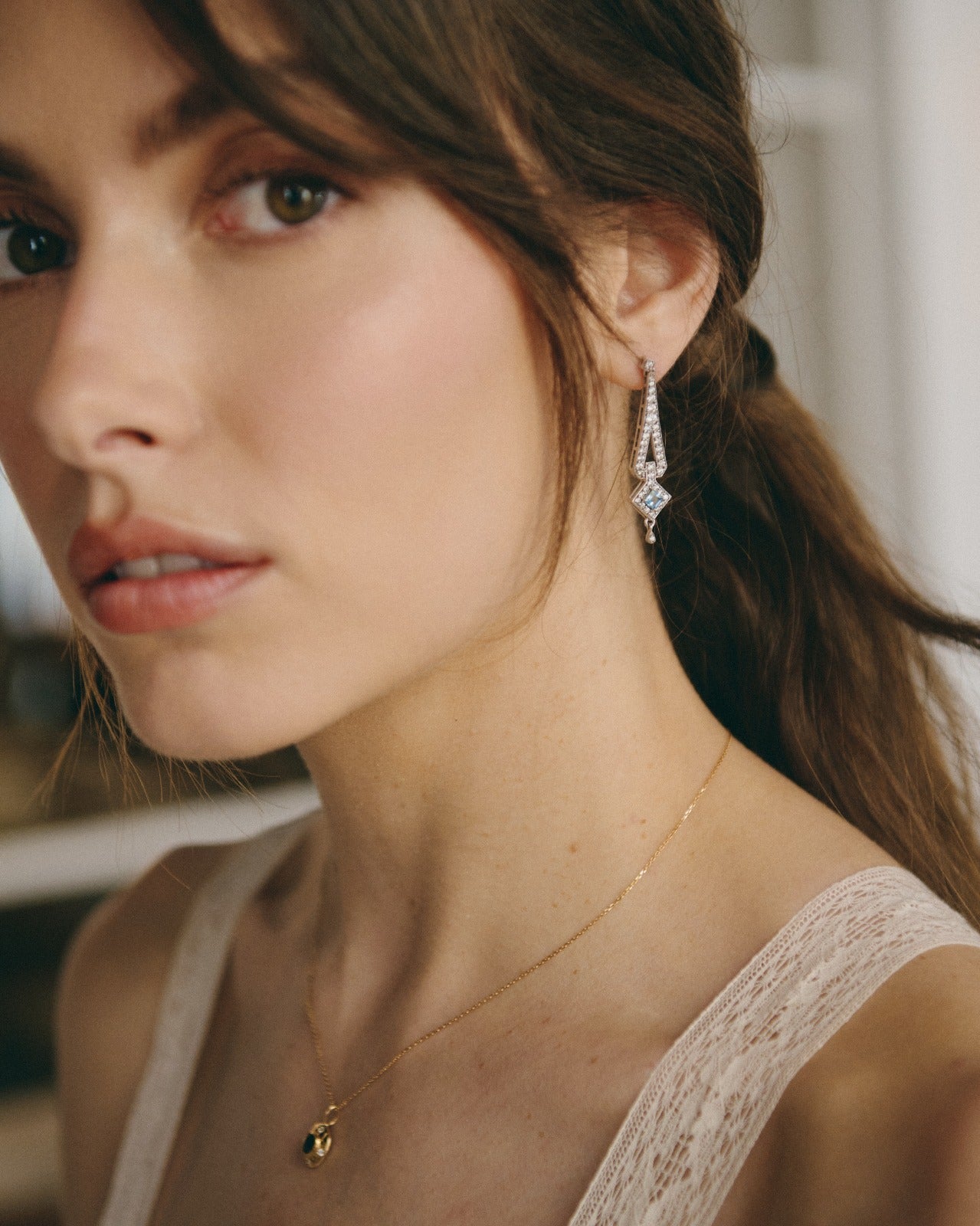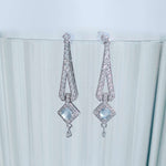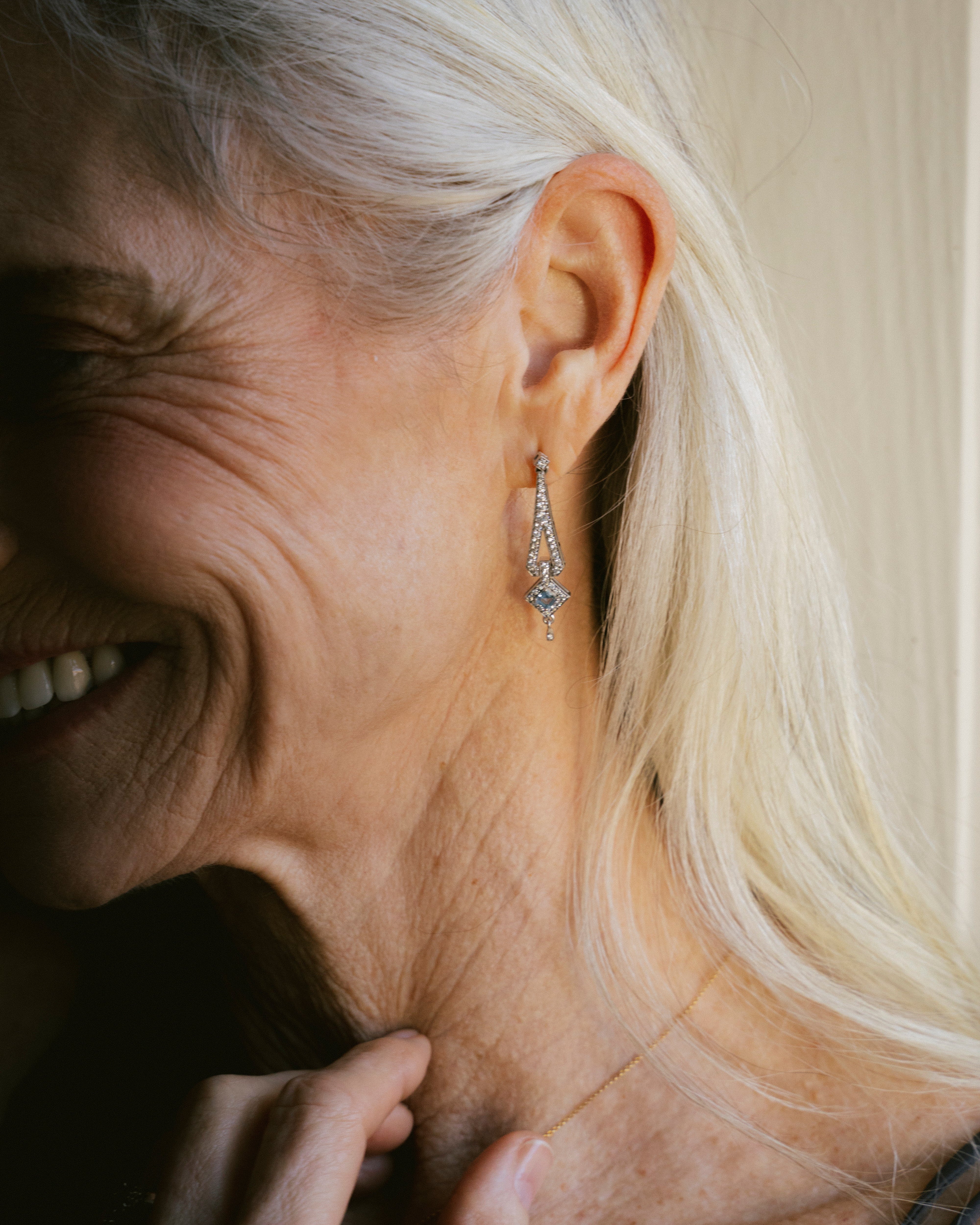 Nuestra pieza estrella en oro blanco, estos pendientes están inspirados en la época de Art Deco, en esta época la inspiración venía de la Bauhaus, pero también había una gran influencia del mundo arqueológico, en concreto de la joyería egipcia faraónica. La aguamarina es la piedra principal de esta pieza, aunque como en las joyas art deco, los diamantes acompañan todo el contorno de la joya. La aguamarina es la piedra del coraje, y ayuda a calmar la mente.