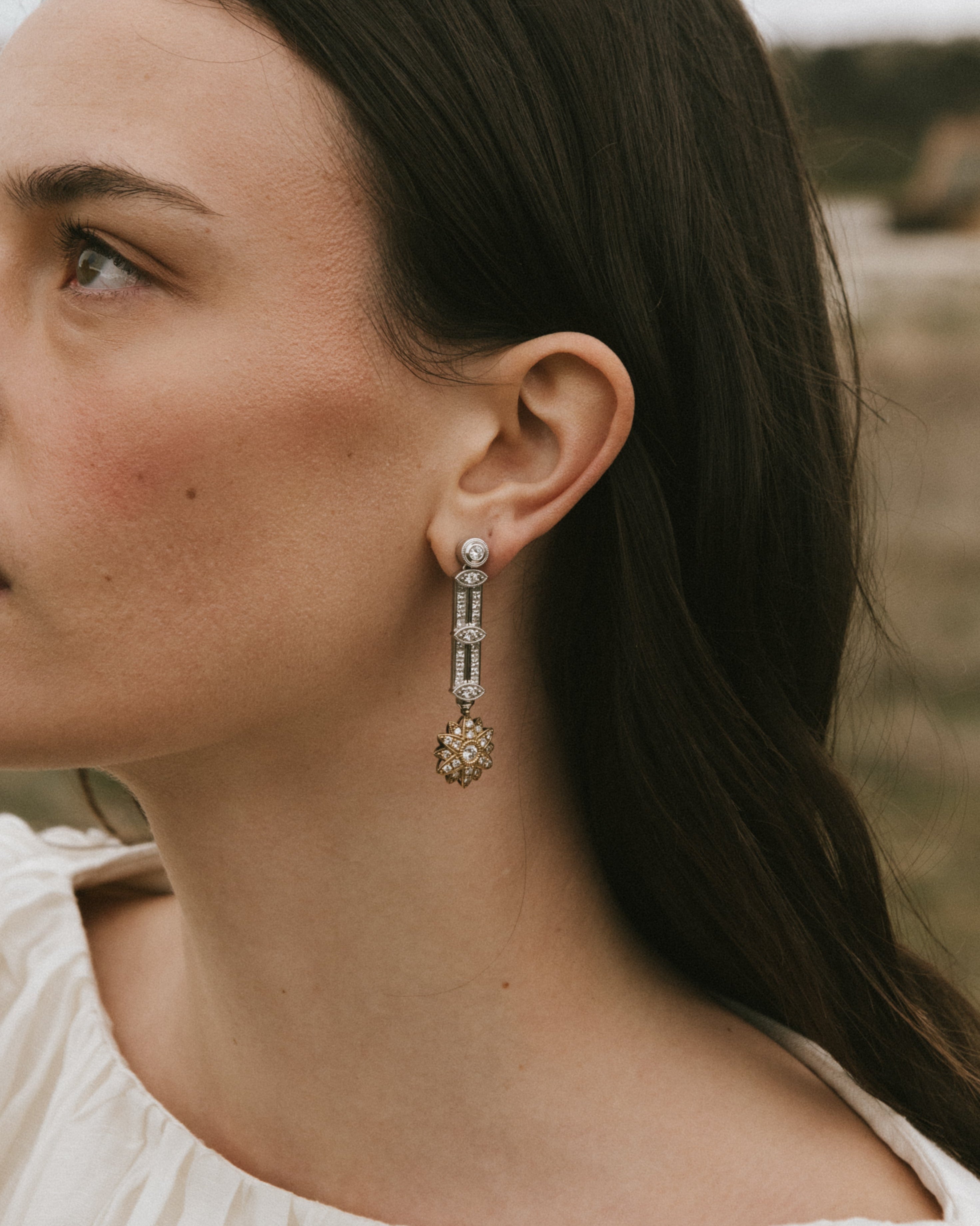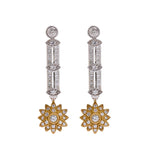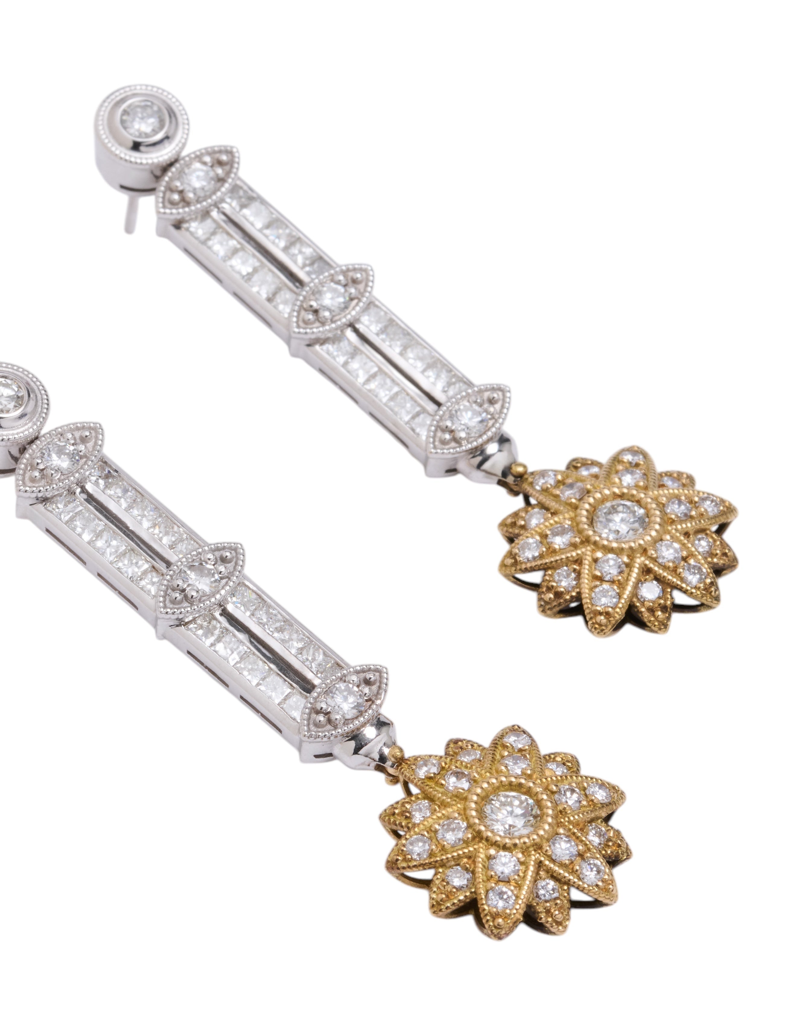 Estos pendientes son pura luz, la expresión de la feminidad, la piedra protagonista son los diamantes de diferentes tallas, un diseño que juega con la combinación de oro blanco y oro amarillo, y remarcan la fuerza y la grandeza, y el resultado es una obra de arte.