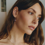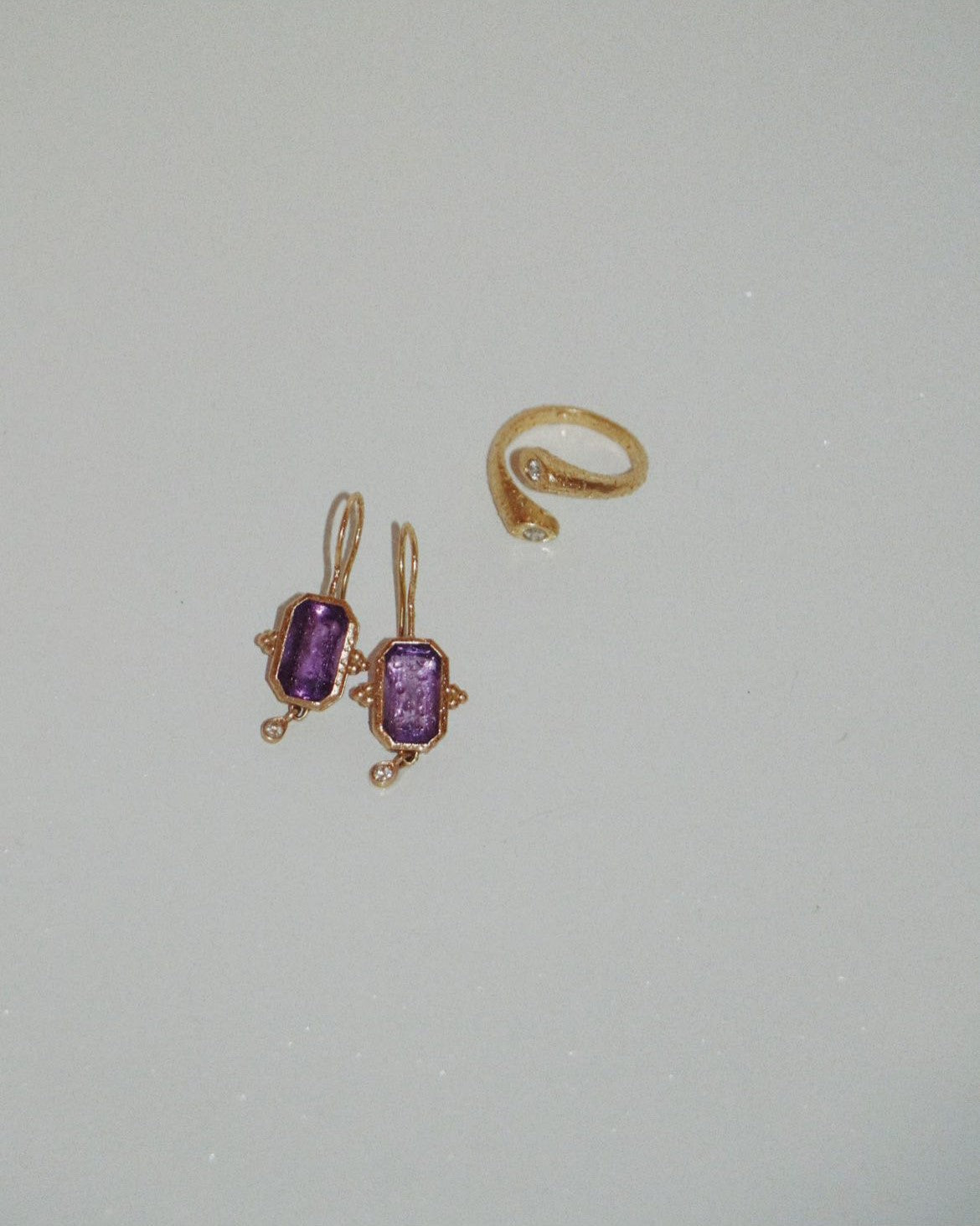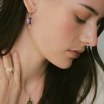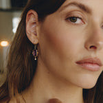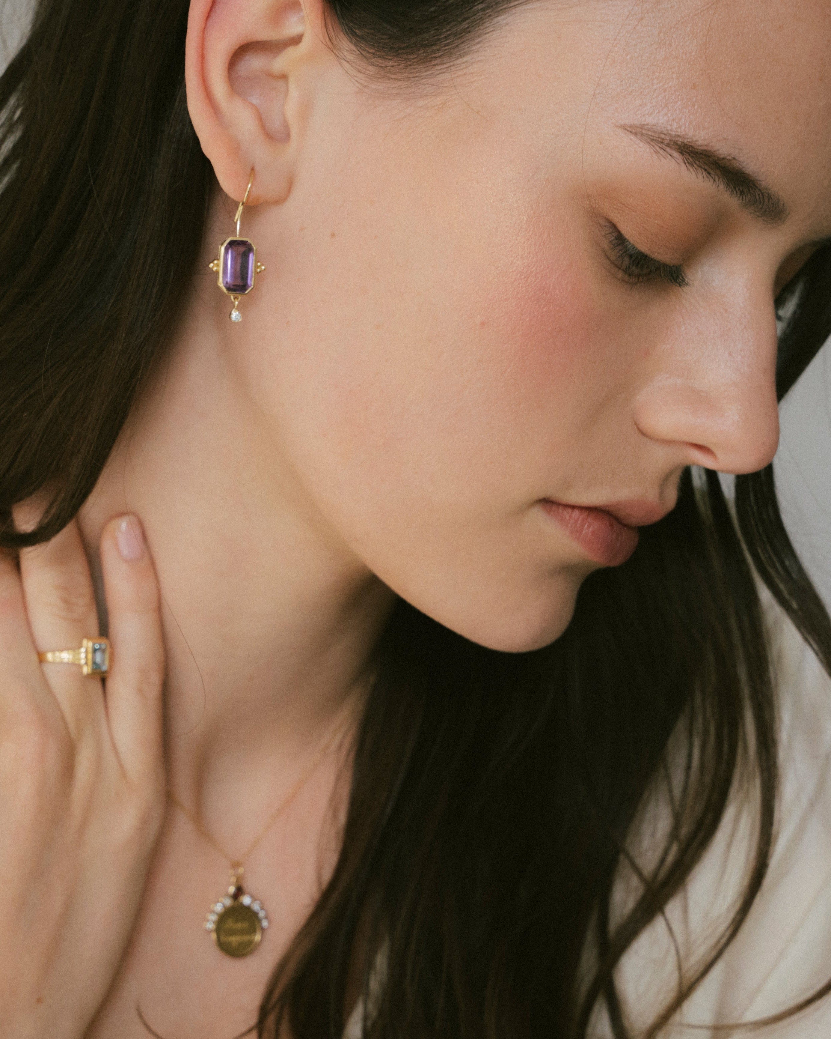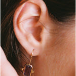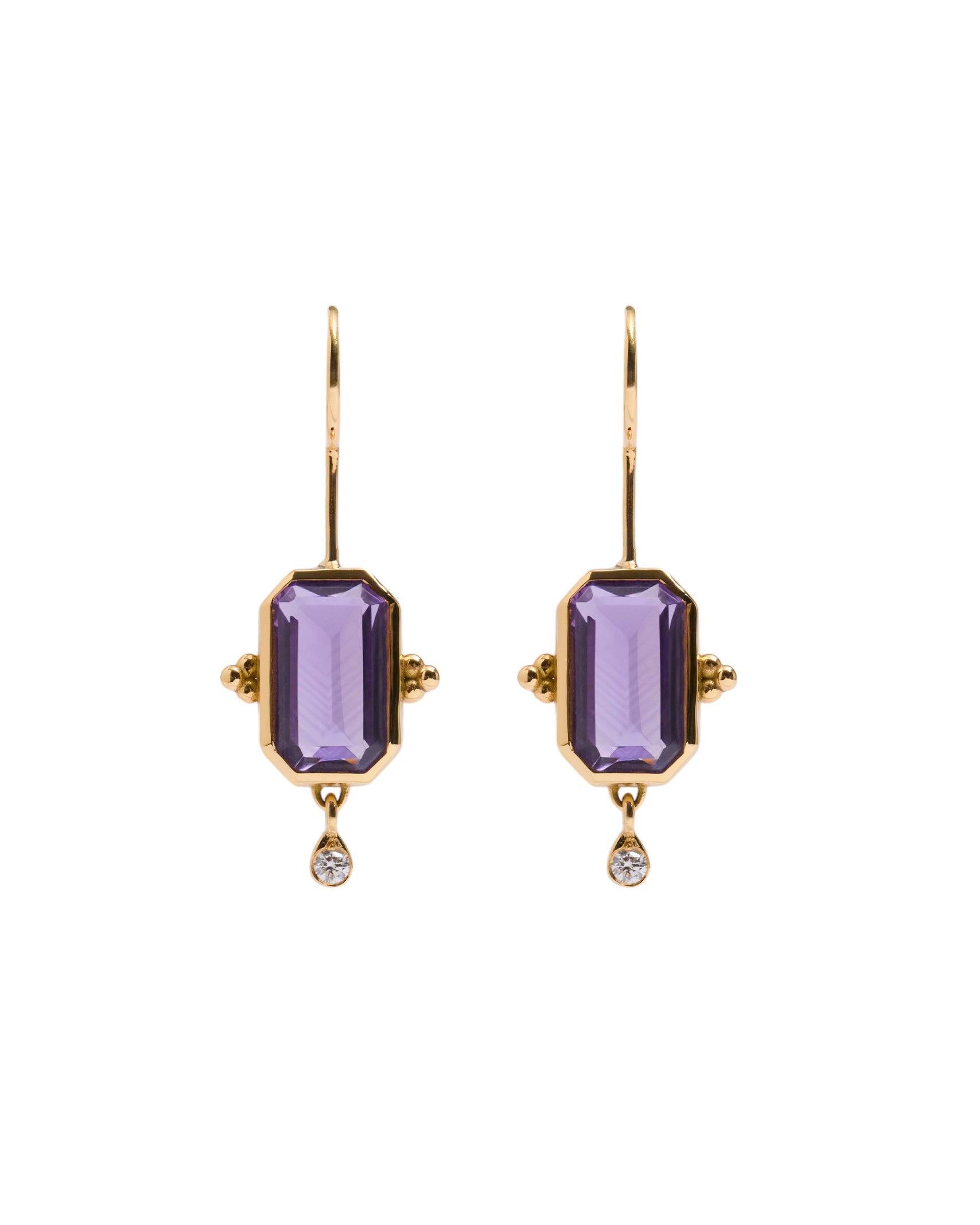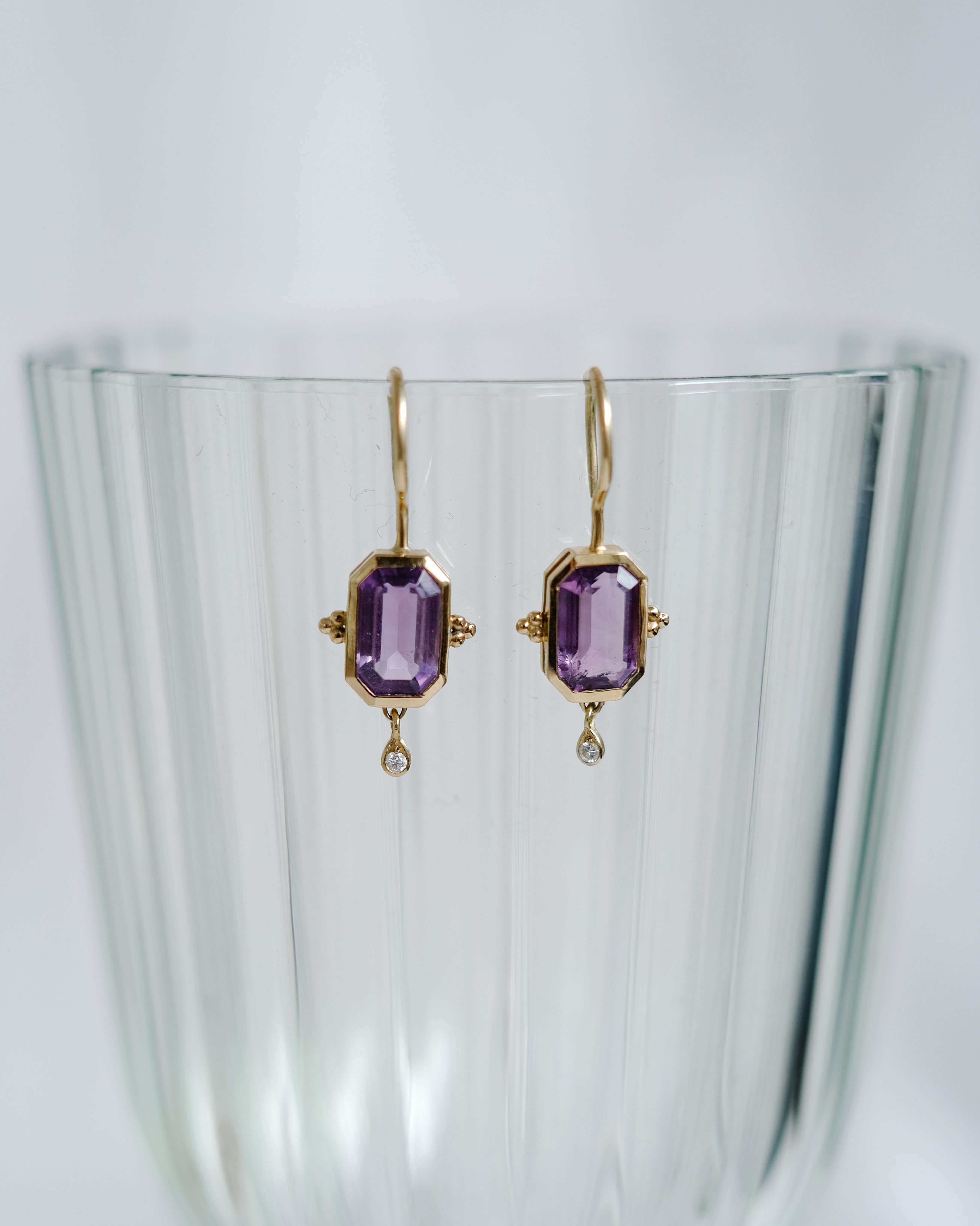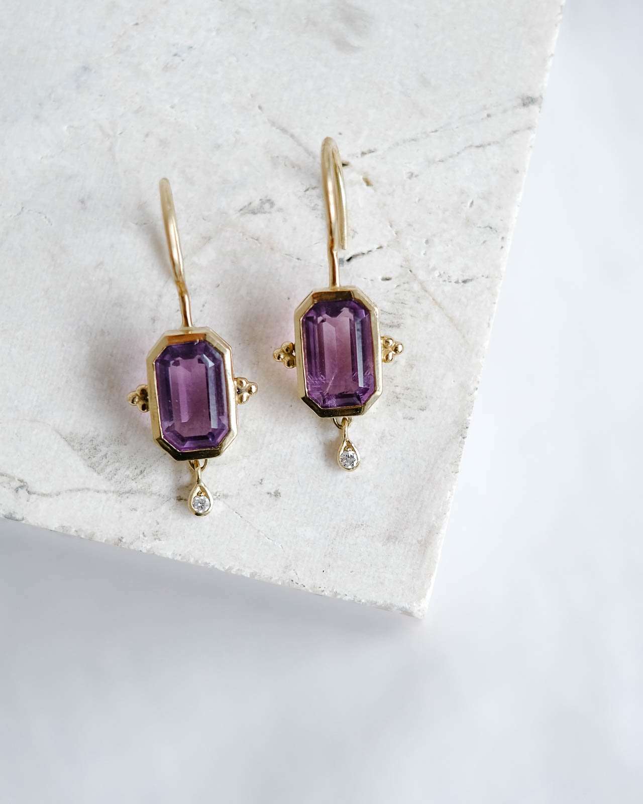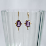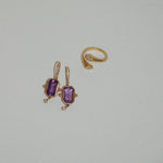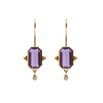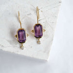 Este diseño es sin duda una pieza muy especial. Los pendientes Rosalinda tienen dos piedras principales que son la amatista y el diamante, la amatista es una piedra protectora, además de la fuerte personalidad que le da su color intenso y el contraste que hace éste con el oro. El diamante aporta luz y movimiento a esta joya. Son unos pendientes que no pasan desapercibidos.