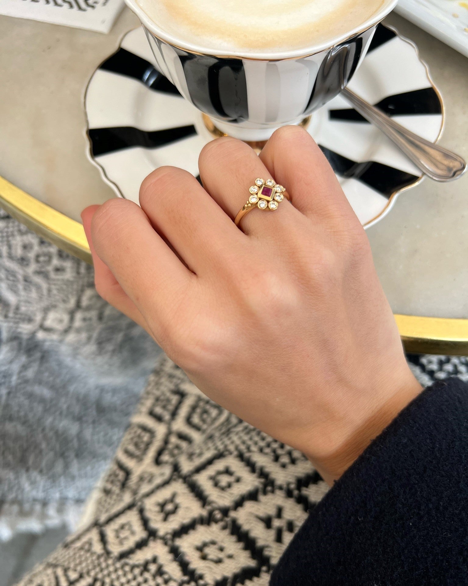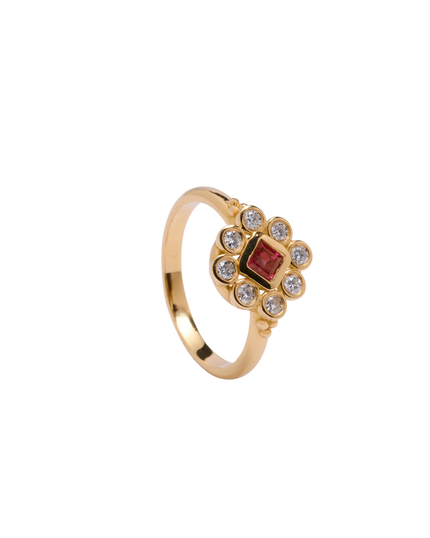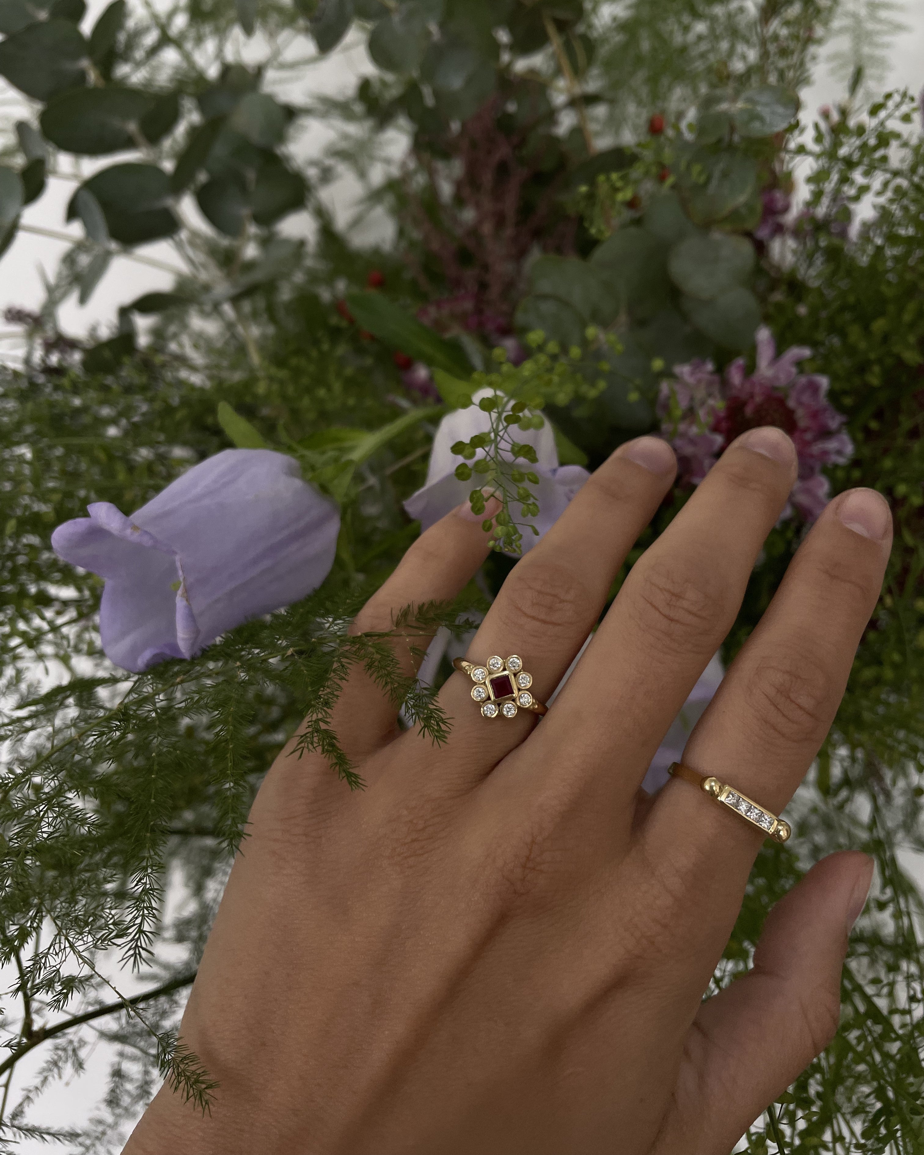 Esta sortija está inspirada en una joya familiar que ha pasado de generación en generación, elegimos el rubí además de por la belleza y la intensidad de su color, porque es una piedra que activa las energías, actúa sobre el chacra del corazón y fomenta los sueños positivos.